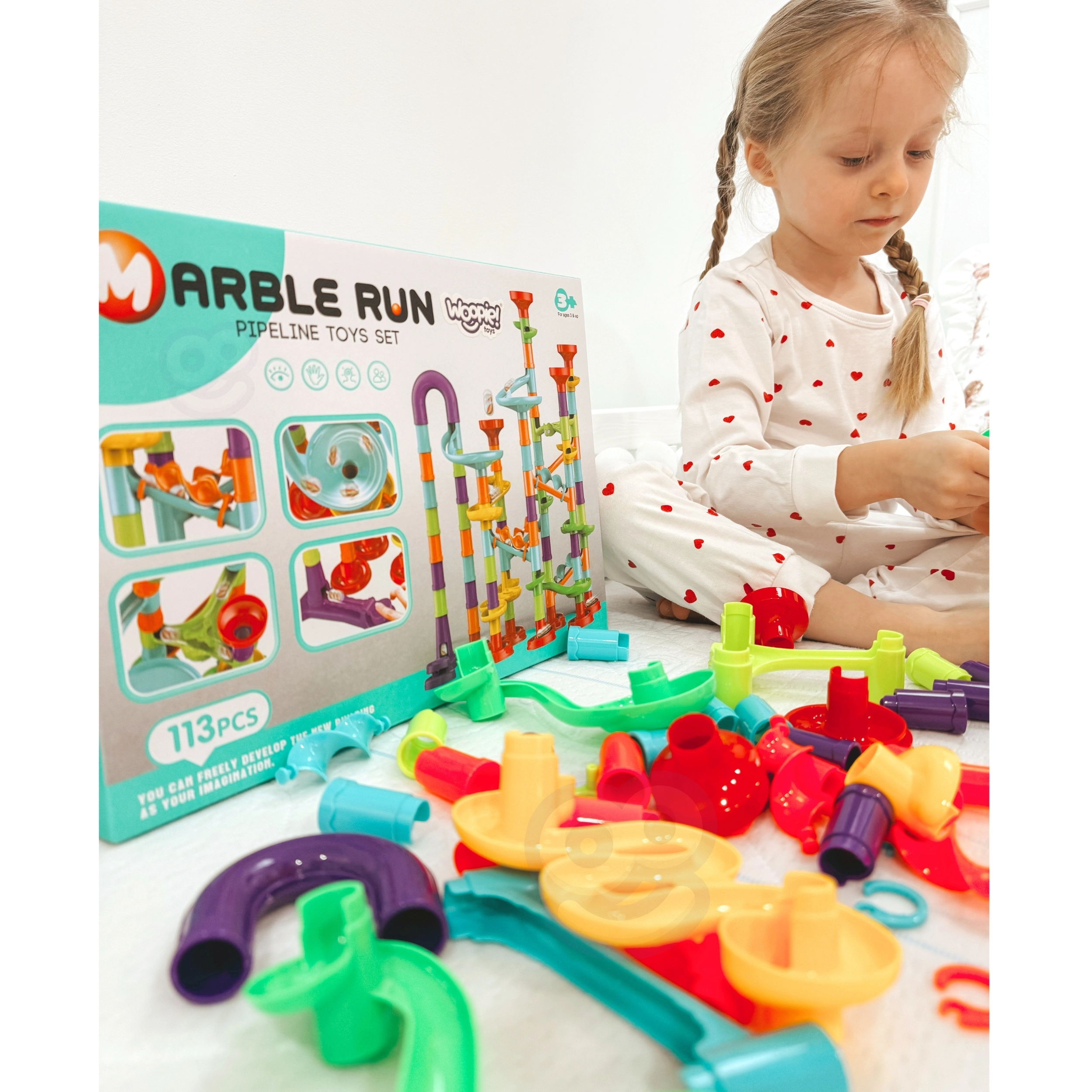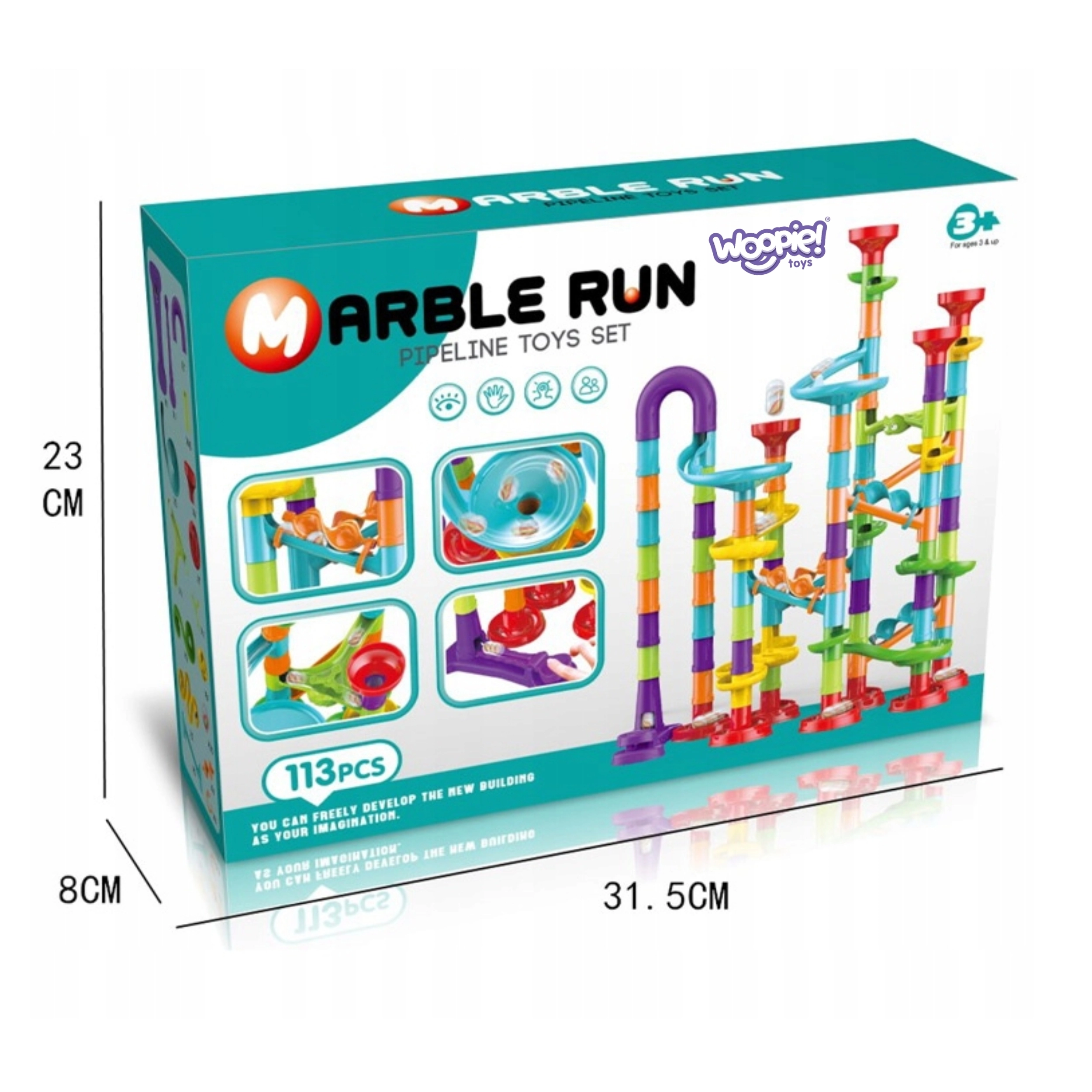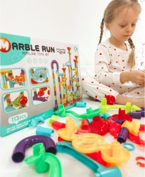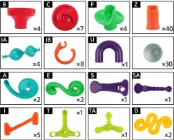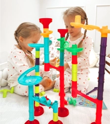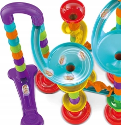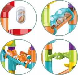 Diversos tubos, curvas, espirales, embudos y columnas permiten construir siempre una pista de canicas nueva y divertida. Construye siguiendo las instrucciones o crea tus propios recorridos ingeniosos.