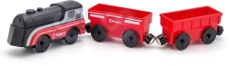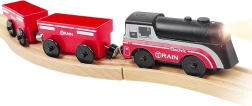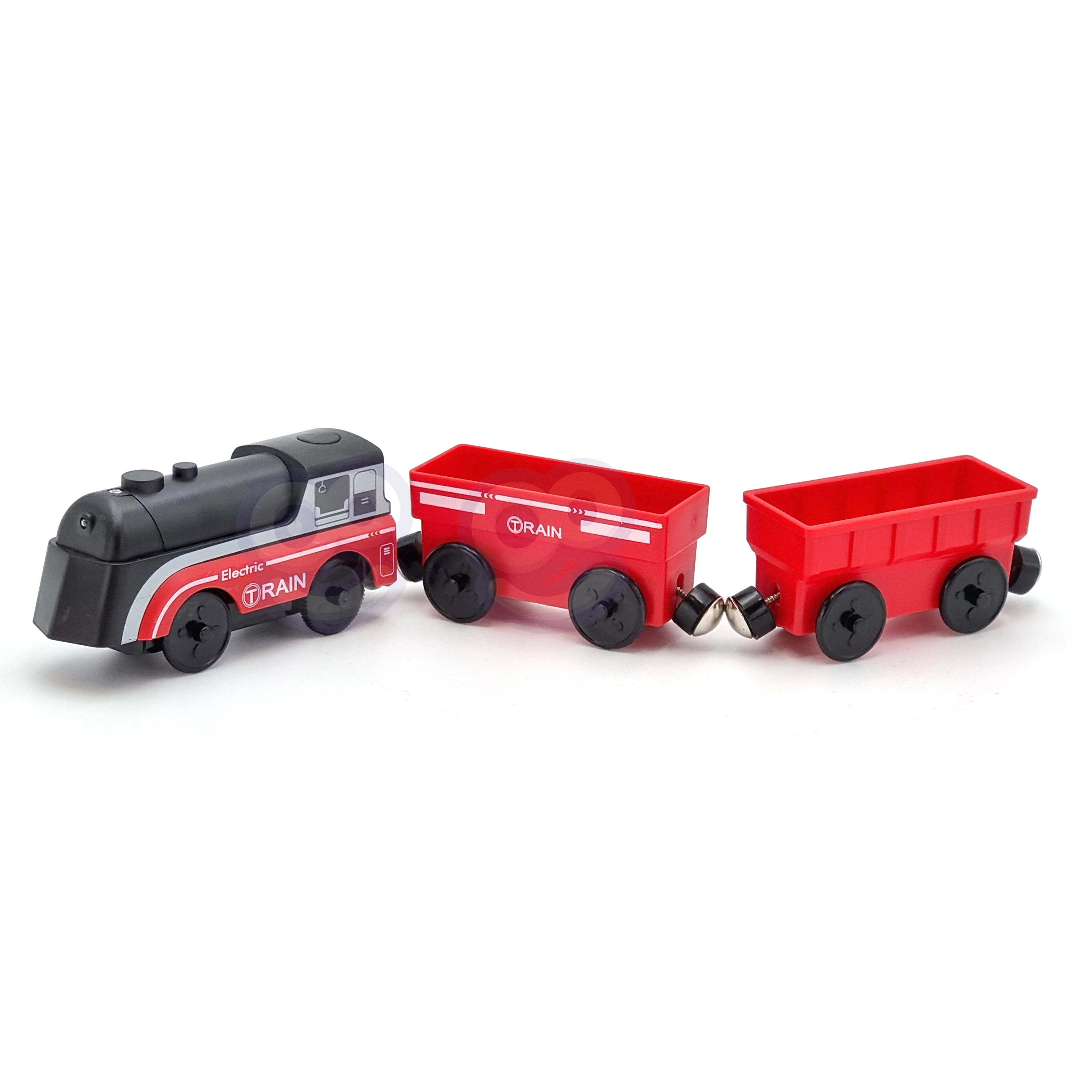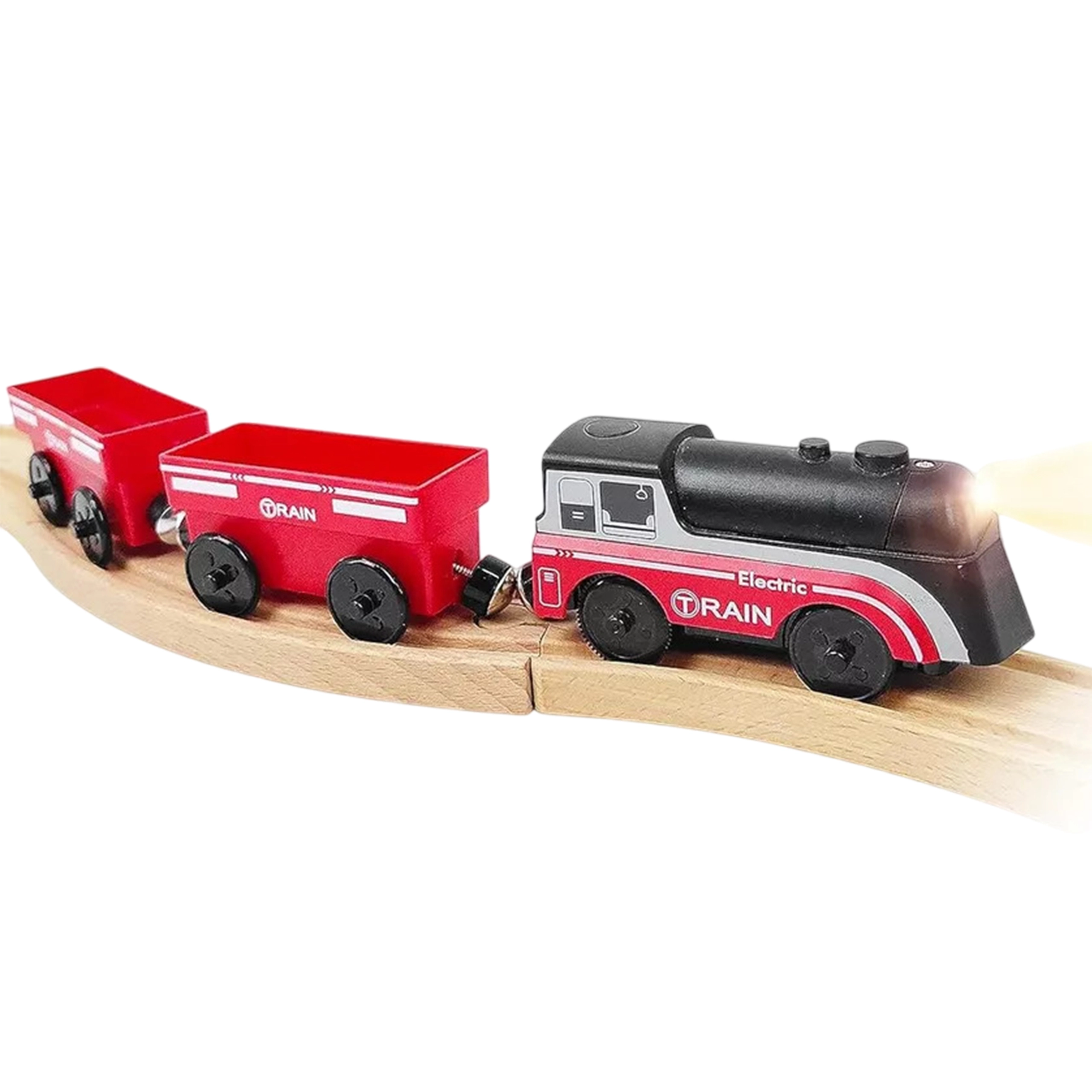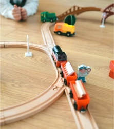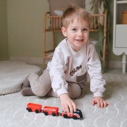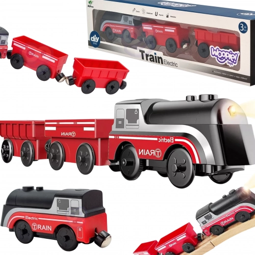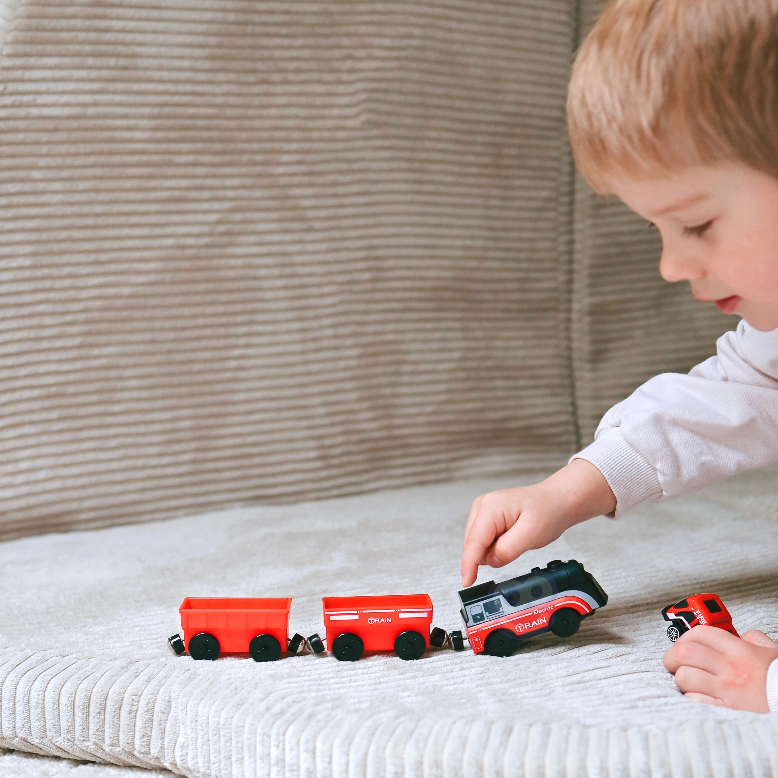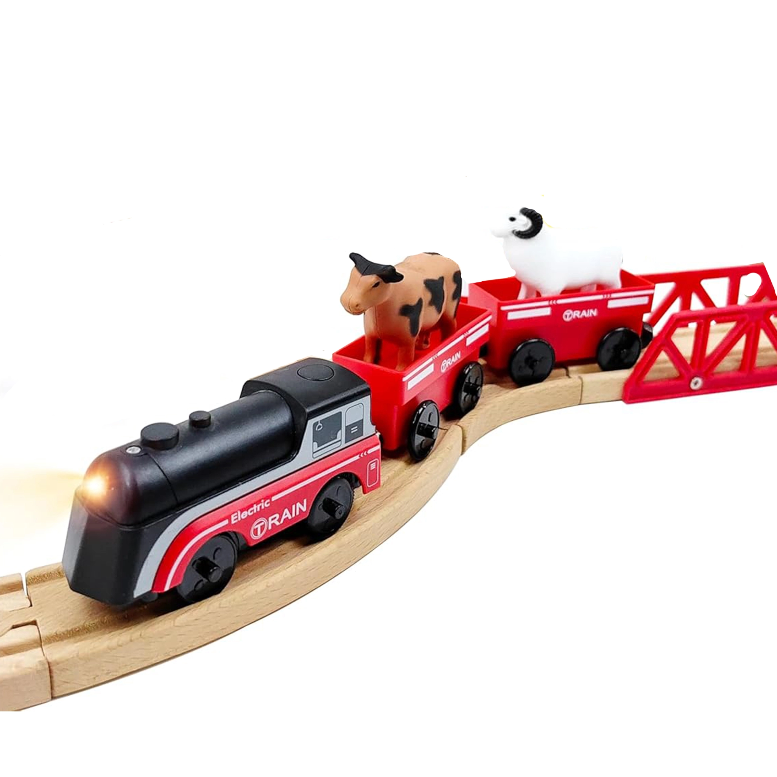 El conjunto utiliza la conexión magnética de los vagones para un acoplamiento rápido e intuitivo. La locomotora se alimenta con una sola pila AAA (no incluida), enciende una luz durante la marcha y se mueve suavemente como un tren real. Gracias al ancho estándar, es compatible con la mayoría de vías de madera (ancho de la vía aprox. 4 cm, ancho del eje aprox. 2,5 cm), complementa perfectamente los sets de IKEA, Brio y otros.