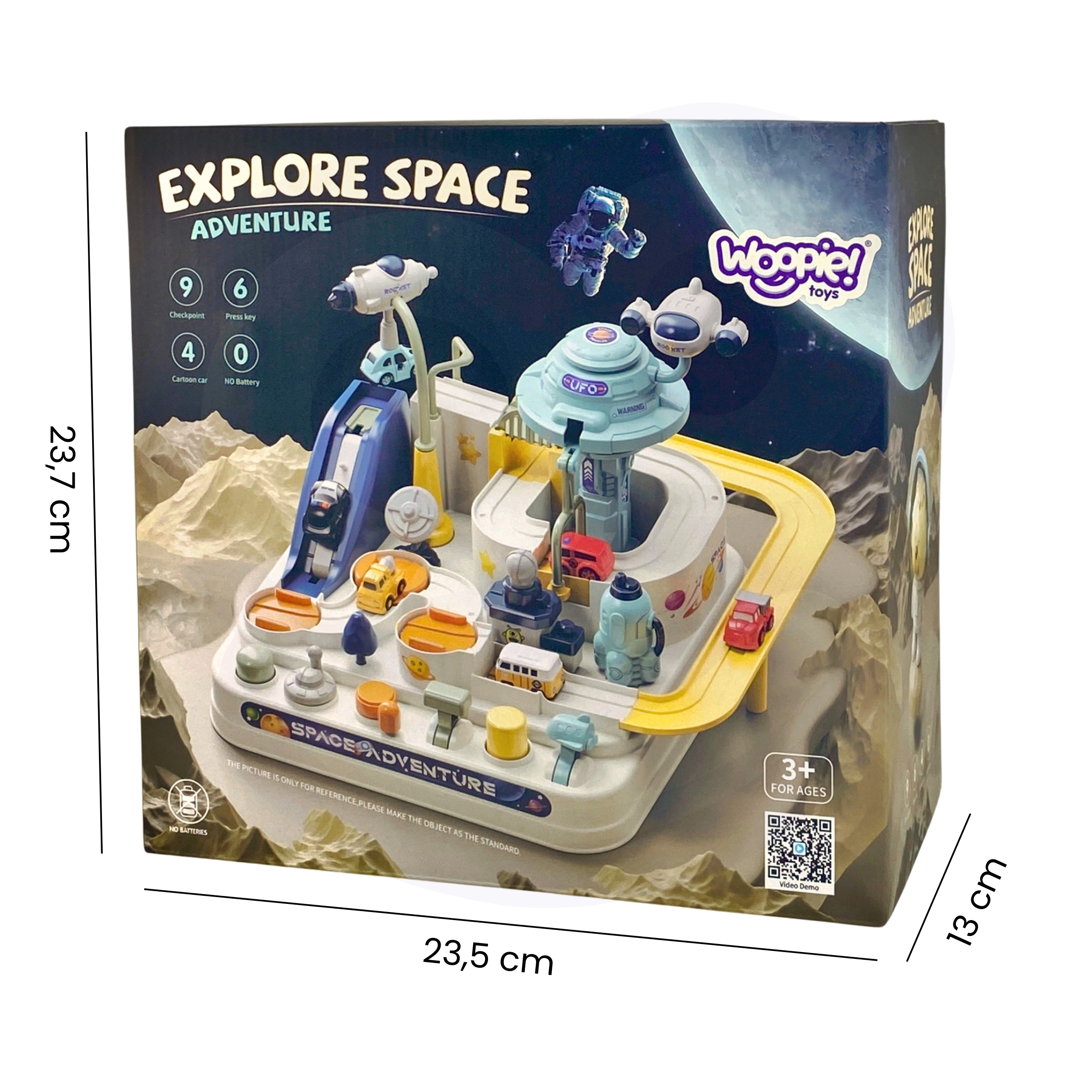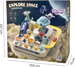 Sin necesidad de baterías y con un completo conjunto de elementos, esta pista fomenta la autonomía y la concentración. Cuatro cochecitos diferentes y numerosos elementos interactivos inspiran a crear historias y escenarios propios del mundo espacial.