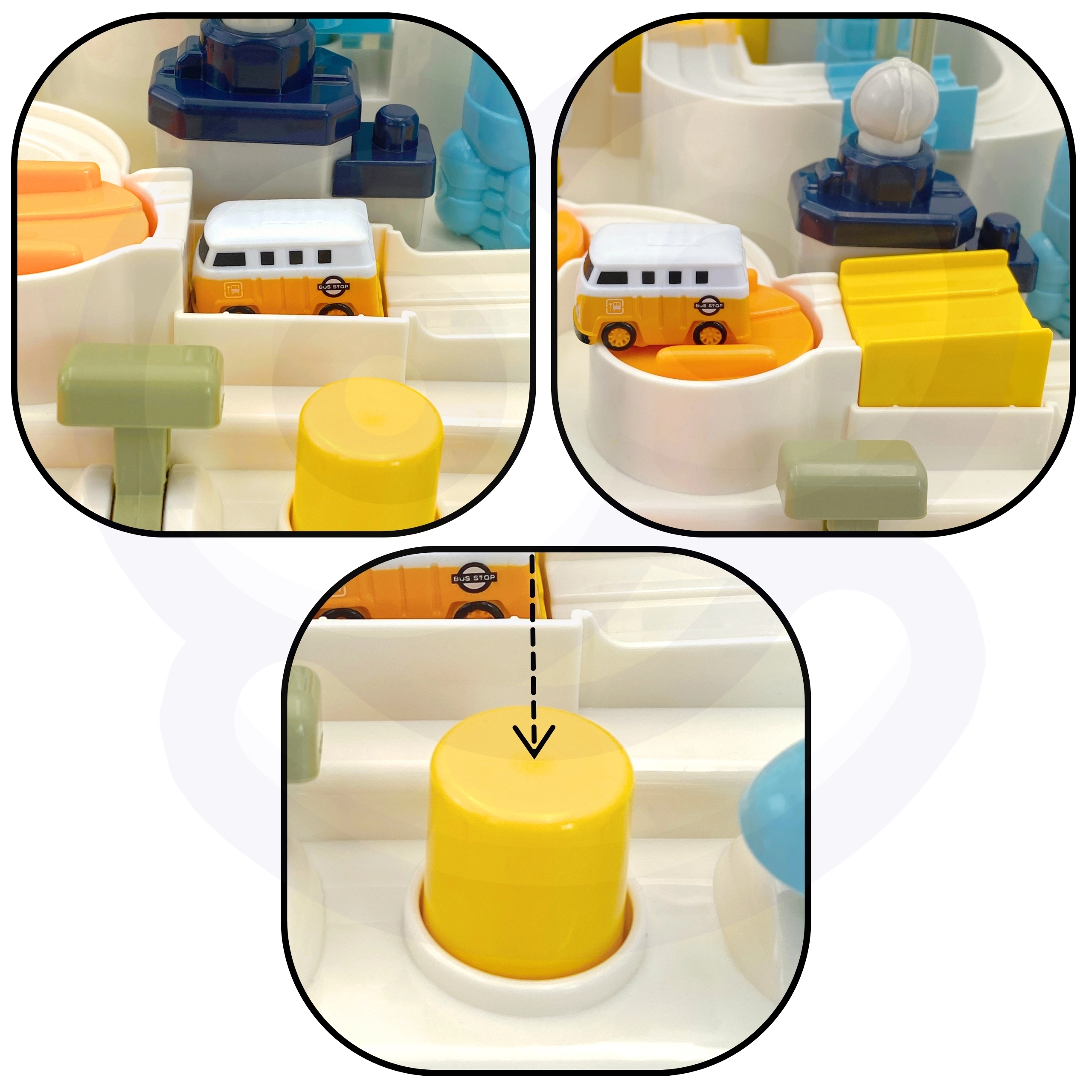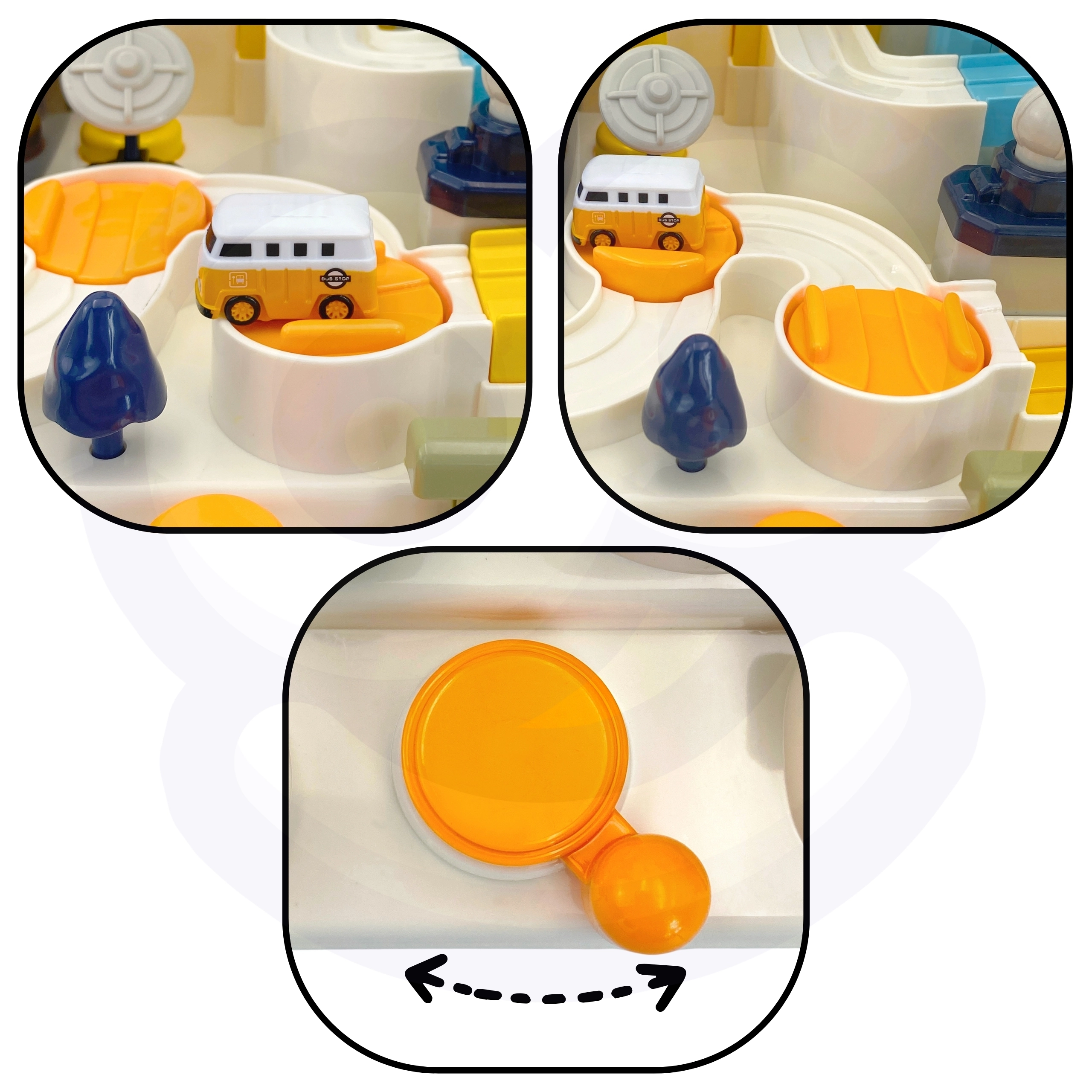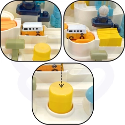 Palancas, botones y ruedas ponen en marcha toda la pista. El niño entrena la motricidad fina, la coordinación y la concentración de manera puramente manual.