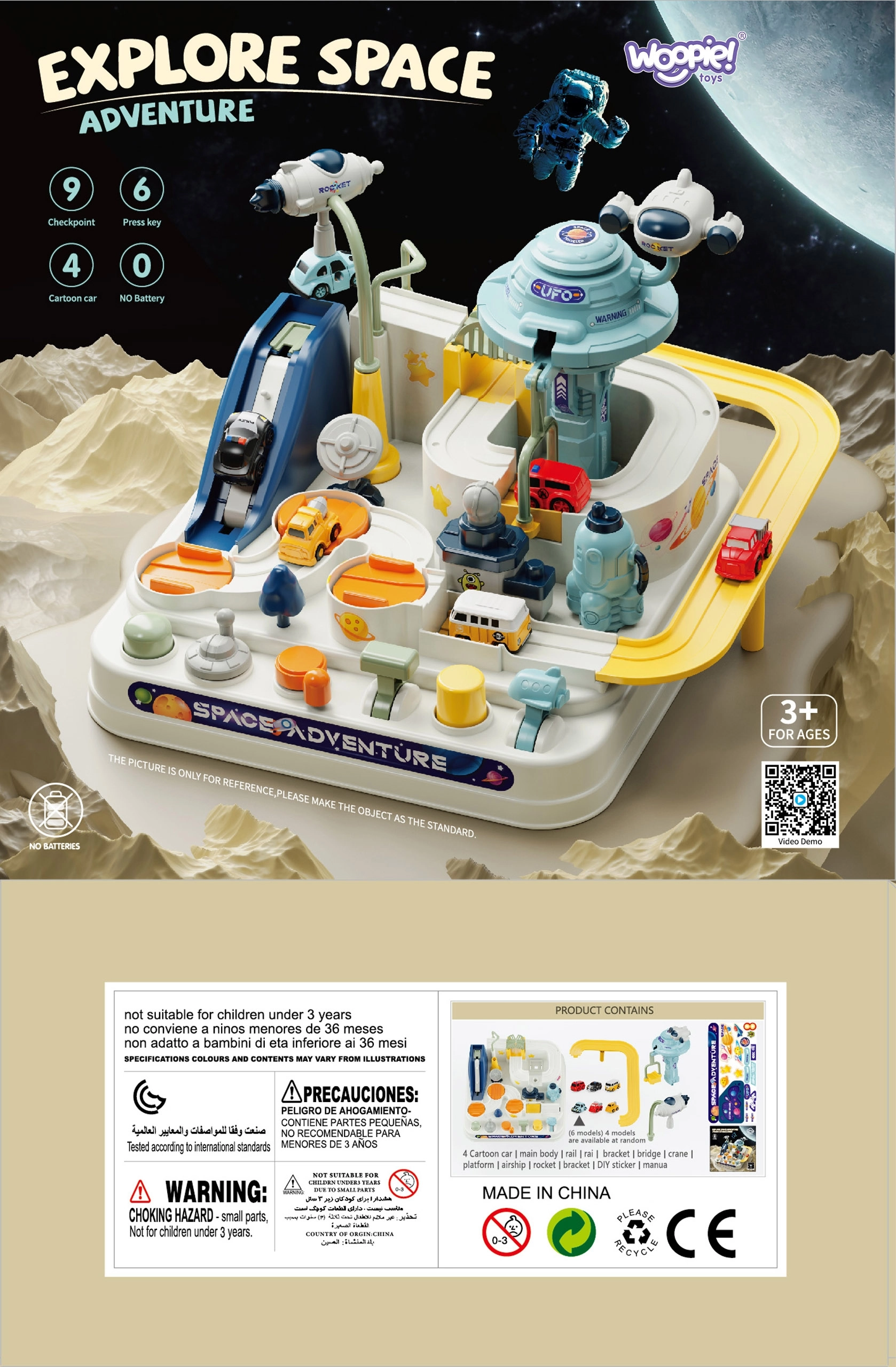 Descubre el infinito universo de la imaginación con la pista interactiva de cochecitos Woopie. Los niños controlan el movimiento de los vehículos mediante palancas mecánicas, botones y interruptores, sin baterías. La divertida base espacial con lanzador, plataformas móviles y ascensor entrena la motricidad fina, el pensamiento lógico y la coordinación mano-ojo.