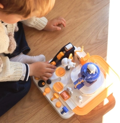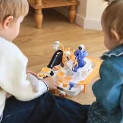 La estación espacial se convierte en un campo de juego lleno de acción: los niños planifican la ruta, superan obstáculos y, con botones y mandos, dirigen los cochecitos por rampas, ascensores y plataformas giratorias. La nave magnética transporta los vehículos “por el aire” hasta el puente elevadizo, que se puede bajar y subir según sea necesario.
