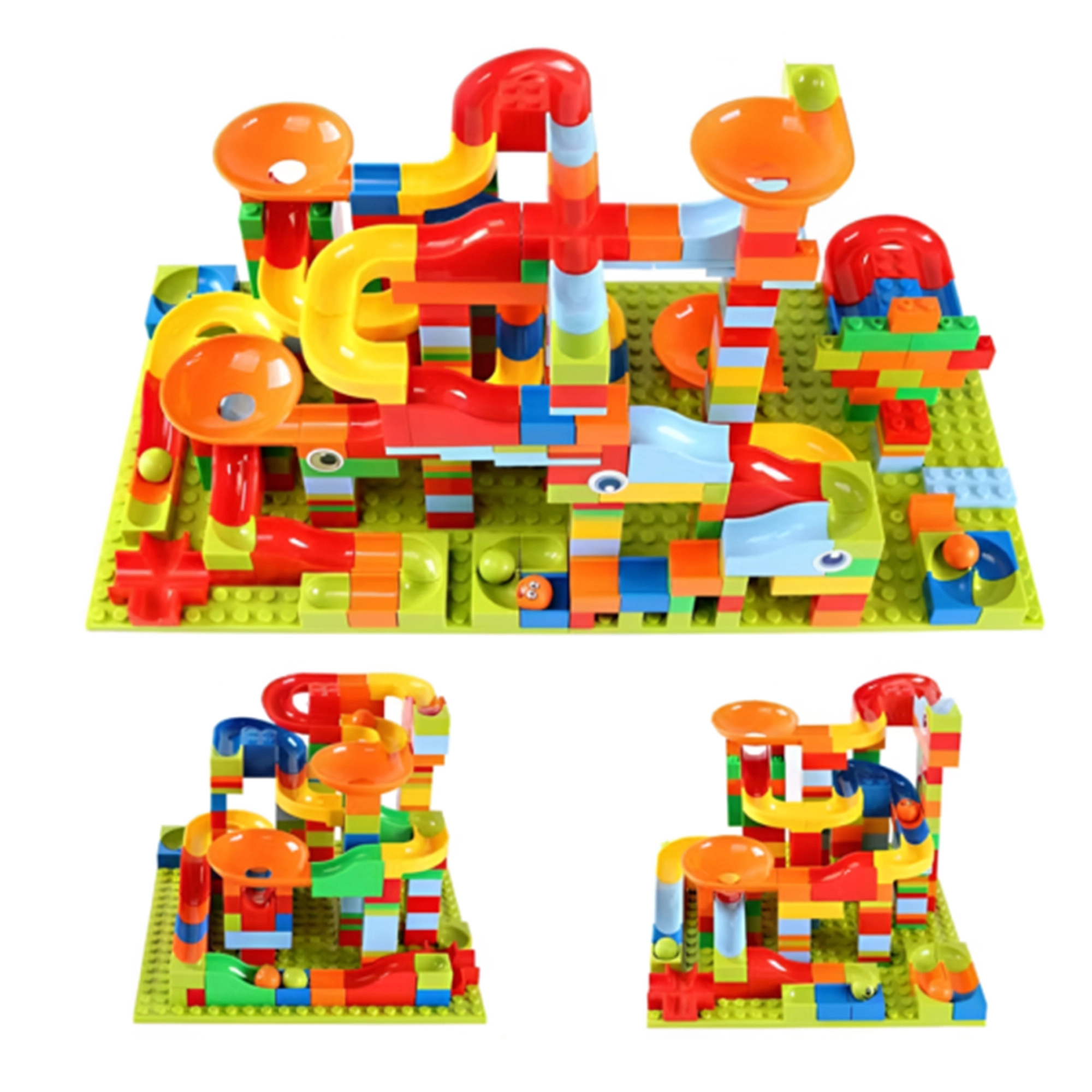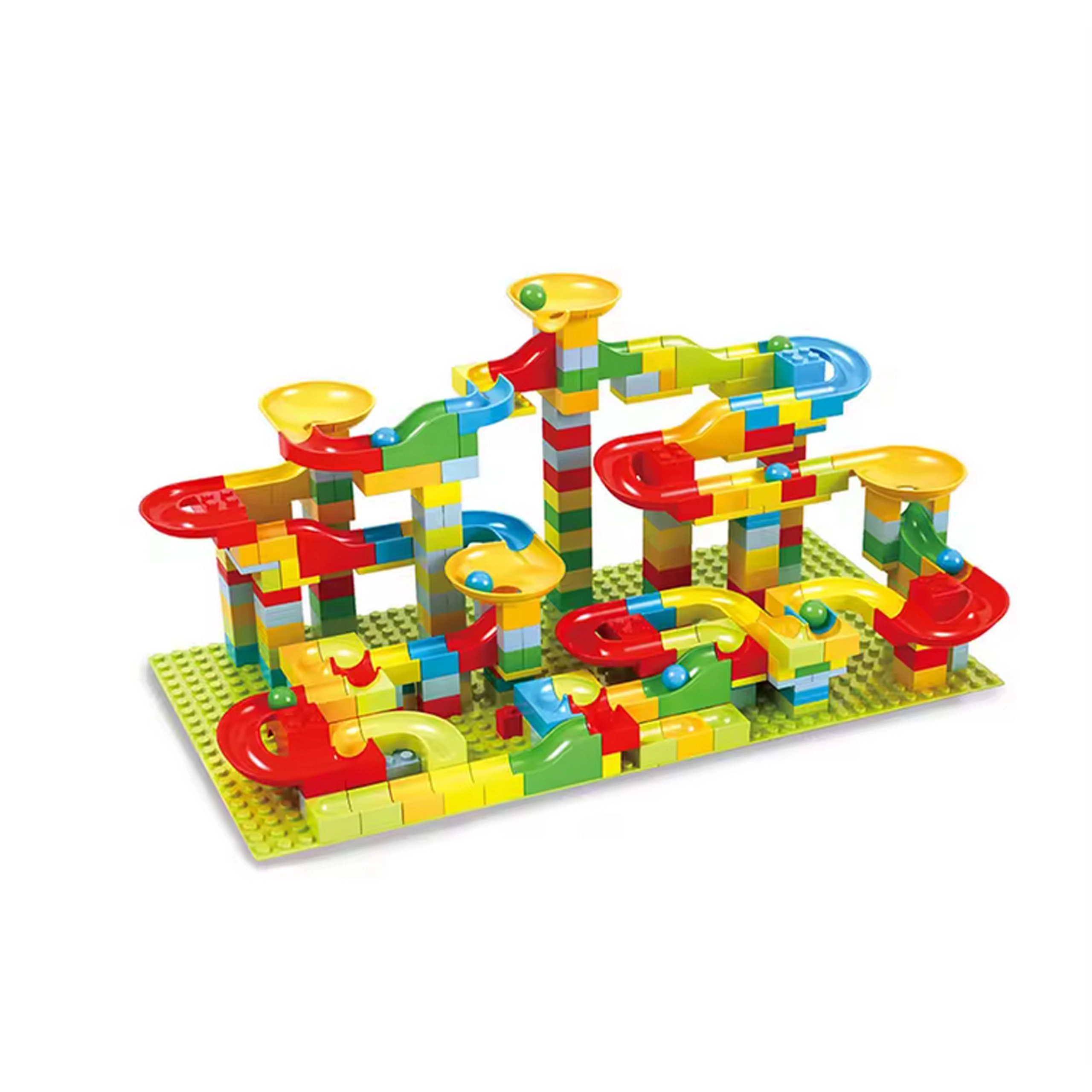 Paquete completo con numerosas pistas, curvas, embudos y canicas. Construye recorridos simples y complejos exactamente como los imaginas.