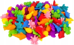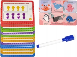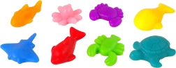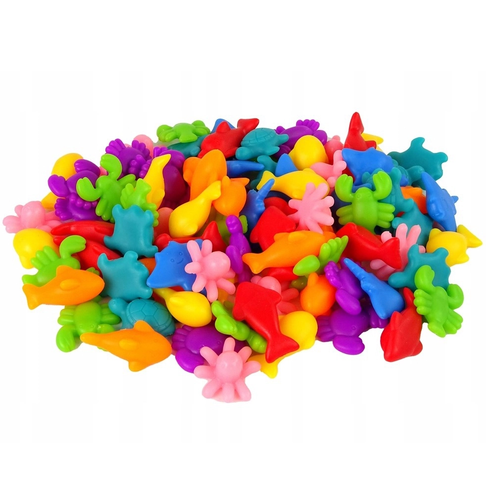 El set incluye un total de 111 piezas, entre ellas 16 tarjetas de tareas, con las que los niños aprenden a ordenar y contar. Las figuras marinas de distintos colores (por ejemplo, delfines rojos, peces amarillos, cangrejos morados) permiten estimular la imaginación y aumentar la interacción con el niño. Todo ello en un entorno seguro gracias a las figuras de goma.