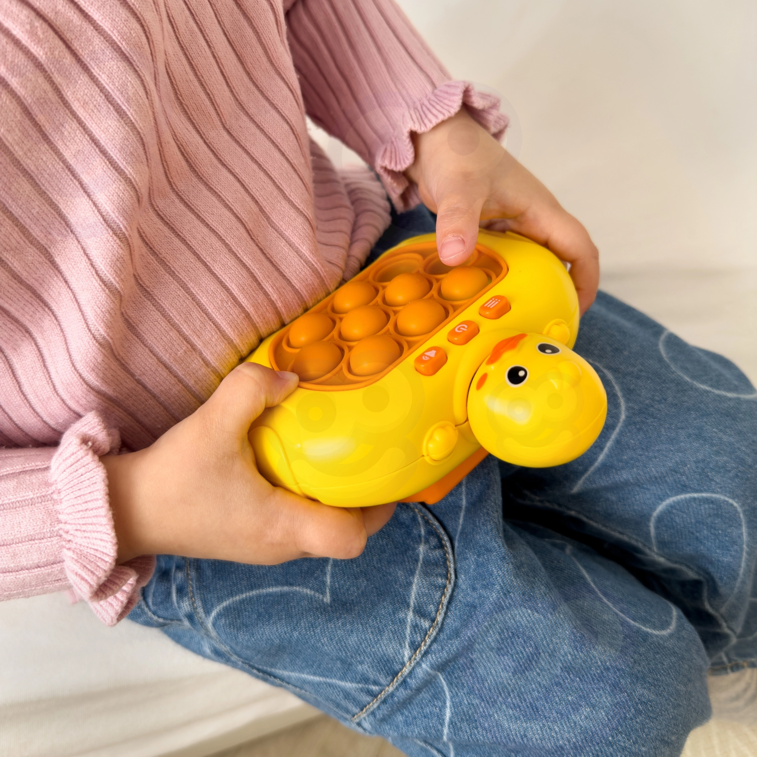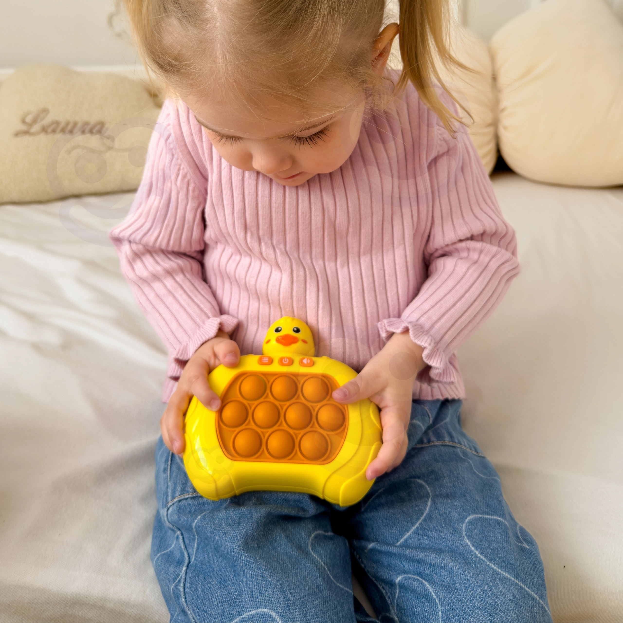 Divertido juguete interactivo POP IT con forma de patito que combina burbujas táctiles con efectos de luz y sonido. Es compacto, ideal para viajar y ayuda de forma excelente a aliviar el estrés. Favorece la motricidad fina, la coordinación y la concentración de niños a partir de 3 años.