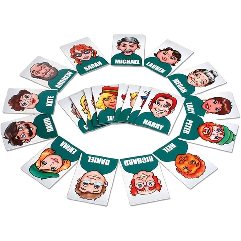 El práctico diseño con dos tableros y conjuntos de personajes garantiza una partida clara que cabe en la mochila. Aprender jugando: los niños desarrollan vocabulario, razonamiento lógico y atención al detalle (color de ojos, peinado, barba, etc.).