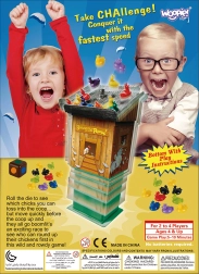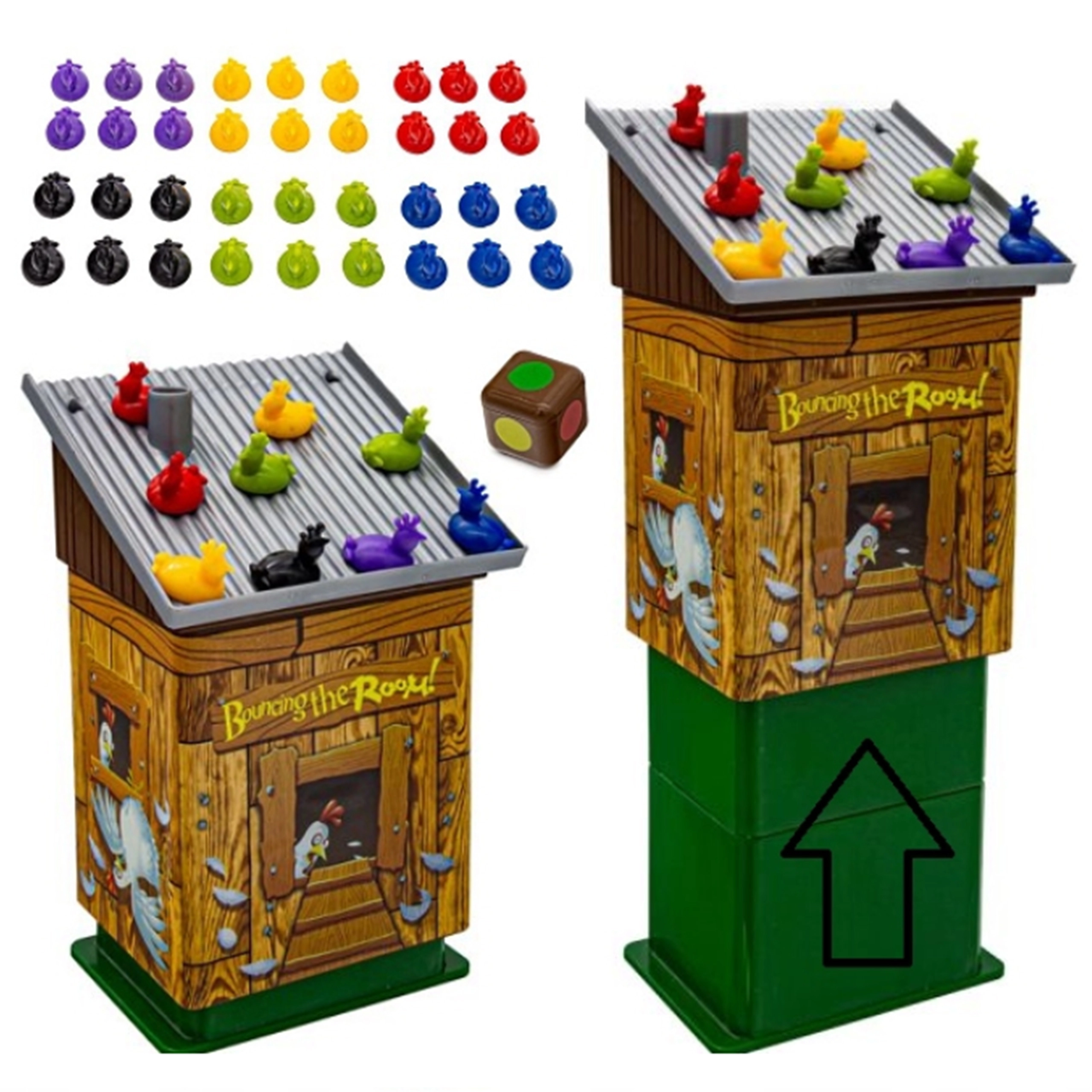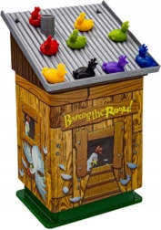 Reglas del juego: Cada jugador recibe la misma cantidad de pollitos de colores. Los jugadores lanzan un dado especial que muestra los colores de los pollitos. El color indica qué pollito debe colocar el jugador en el tejado del gallinero. El objetivo es colocar todos los pollitos en el tejado y ganar la partida.