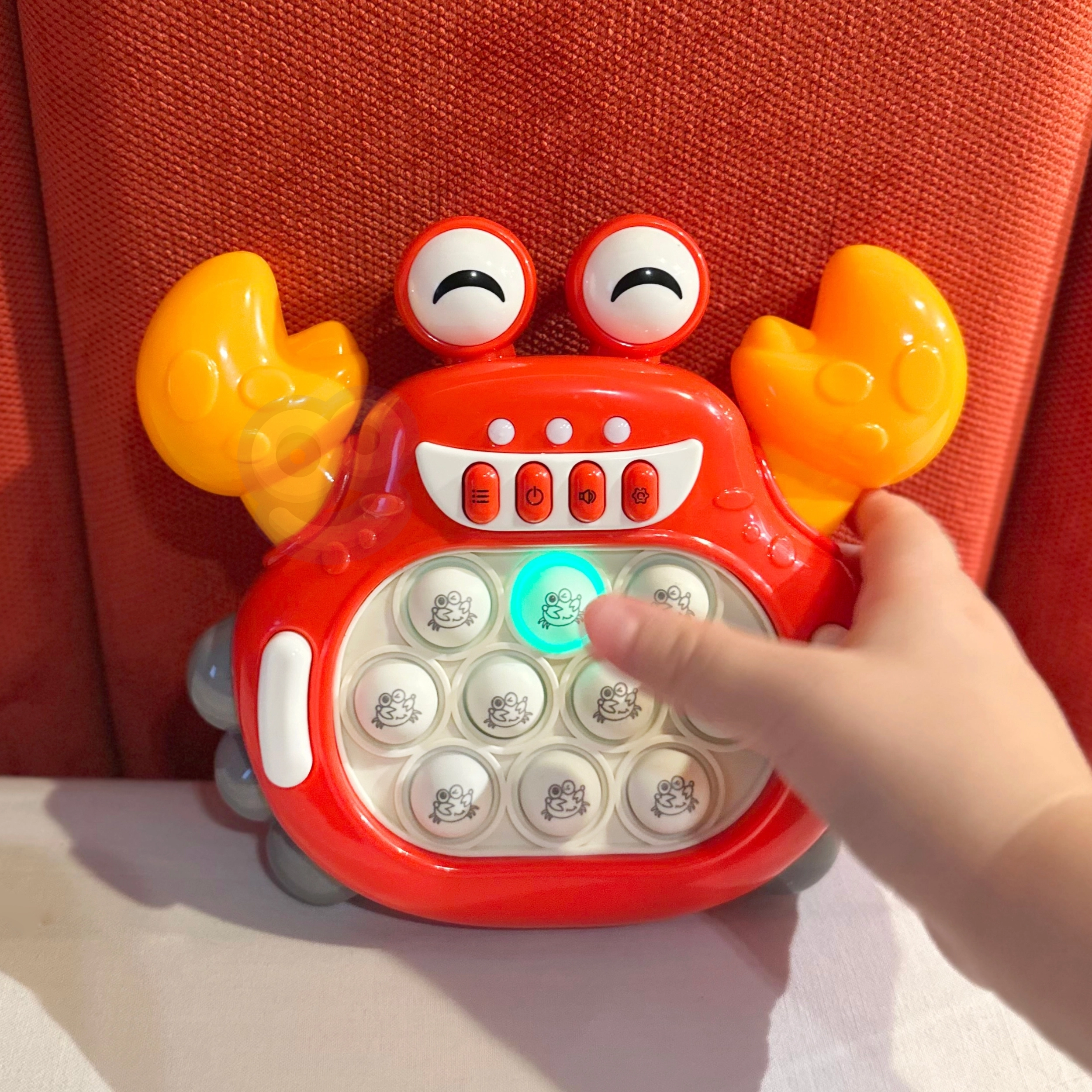 El diseño de cangrejo con ojos grandes y pinzas amarillas atrae a los niños a interactuar y les enseña la motricidad fina.