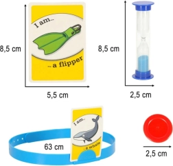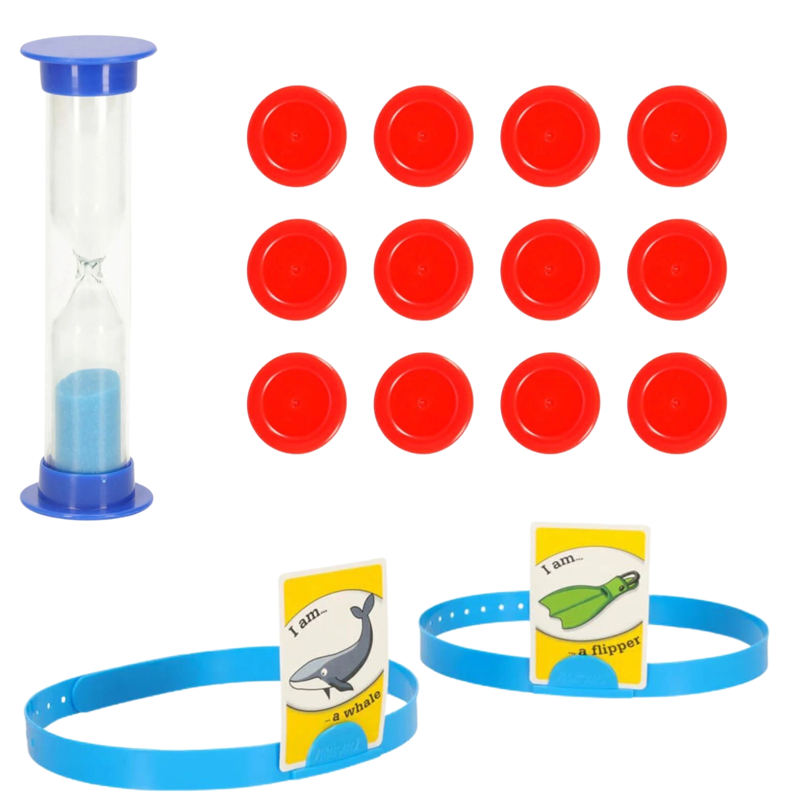 Las diademas resistentes sostienen la carta cómodamente en la cabeza, el reloj de arena marca el ritmo de las rondas y las fichas ayudan con la puntuación. Un set ideal para un juego ágil y emocionante para dos.