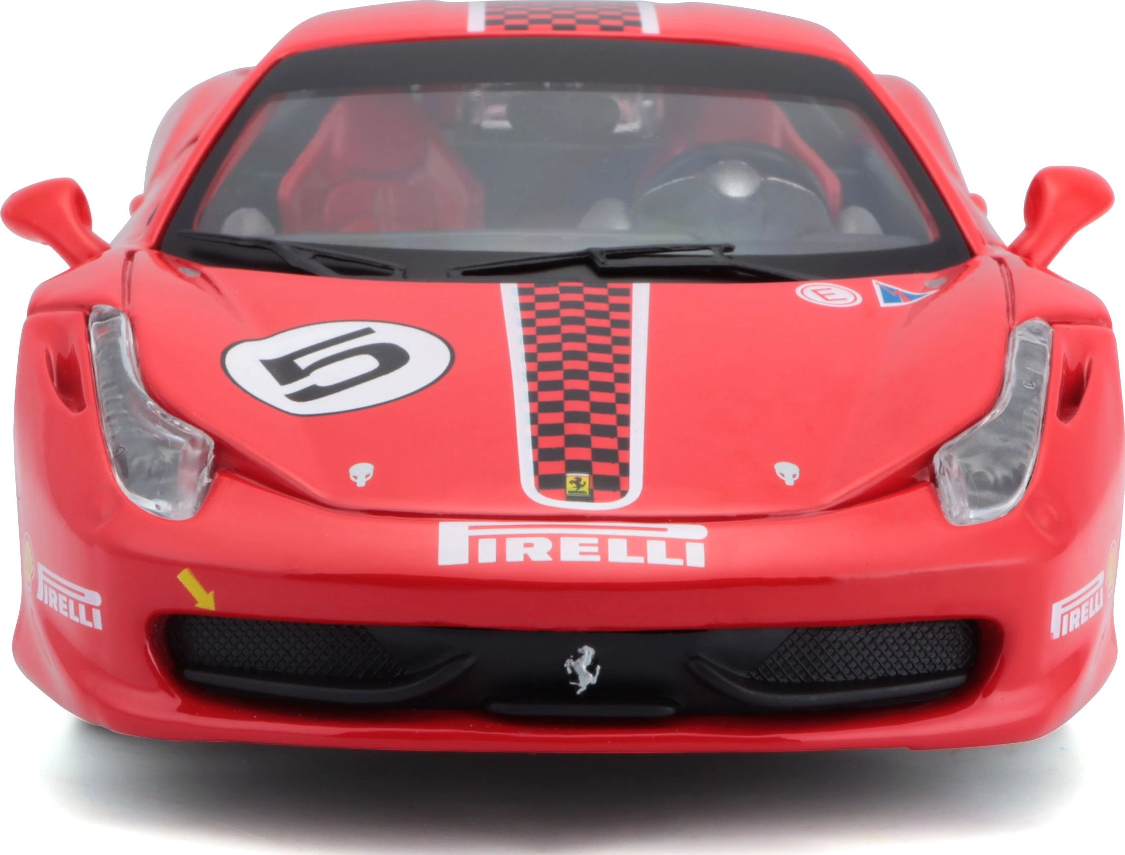 La pintura roja, el dorsal número 5 y los logotipos de patrocinadores aportan al modelo un aspecto de competición fiel, ideal para colecciones de FERRARI.