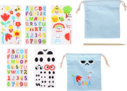 Deja que los niños creen su propia bolsita exactamente como la imaginan. Las pegatinas de letras y números permiten componer el nombre o apodo y completar la bolsita con motivos alegres. El resultado es original y práctico: ideal para guardar pequeñas cosas, lápices, juguetes pequeños o tesoros.