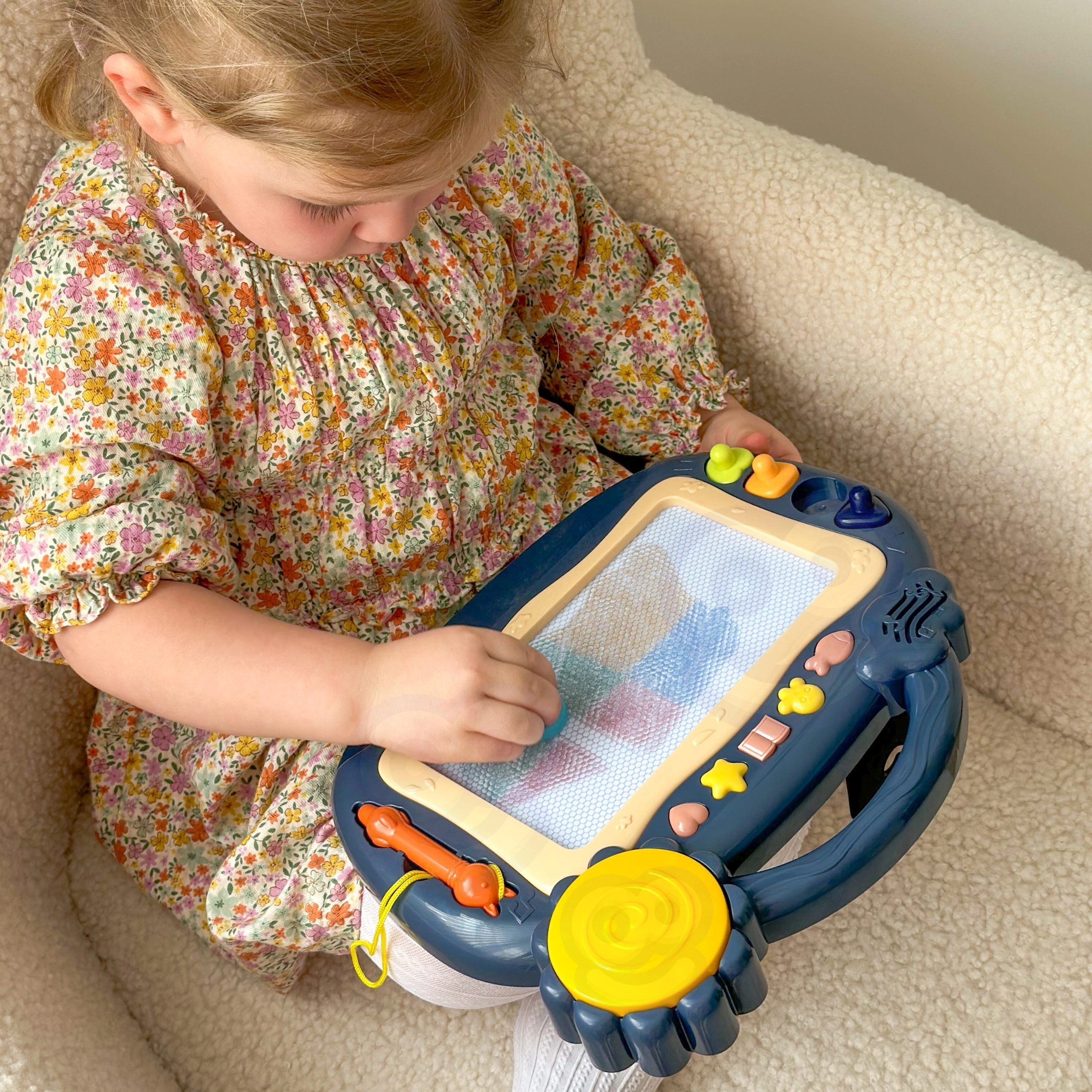 La superficie magnética se borra fácilmente con el deslizador. Con cuatro sellos y el stylus incluido, el niño crea dibujos una y otra vez, sin papel y sin desorden.