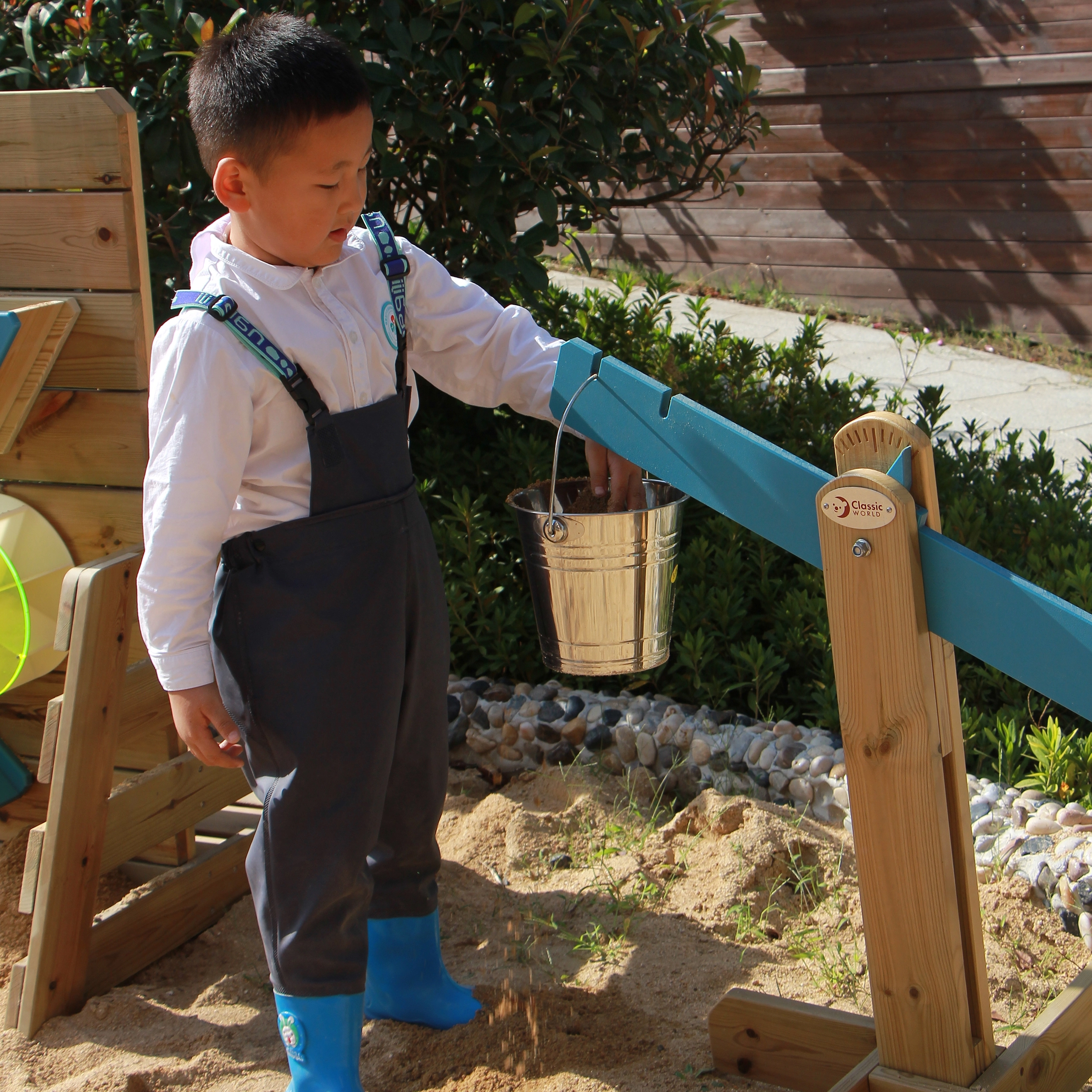 Esta balanza para arenero ofrece a los niños infinitas oportunidades de descubrimiento y juego mediante prueba y error. Los niños llenan los cubos metálicos con diferentes materiales y observan cómo cambia el equilibrio—esto fomenta la comprensión de los fundamentos de la física, el razonamiento lógico y la paciencia.