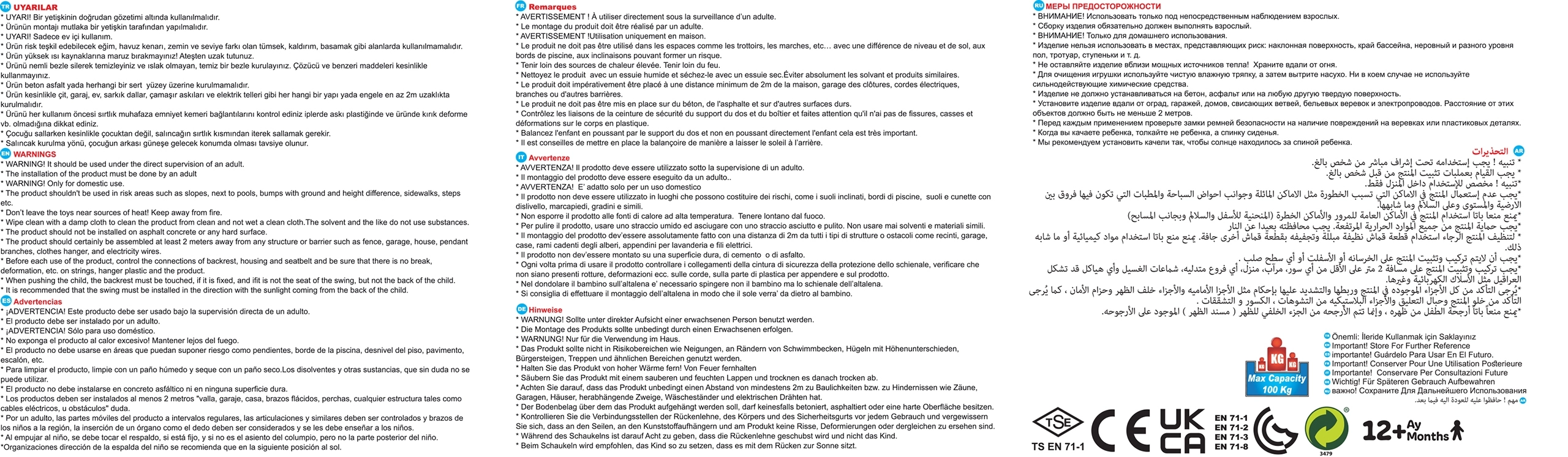 - asiento de plástico, respaldo desmontable, barra frontal desmontable, arnés de seguridad, cuerdas de montaje, ganchos