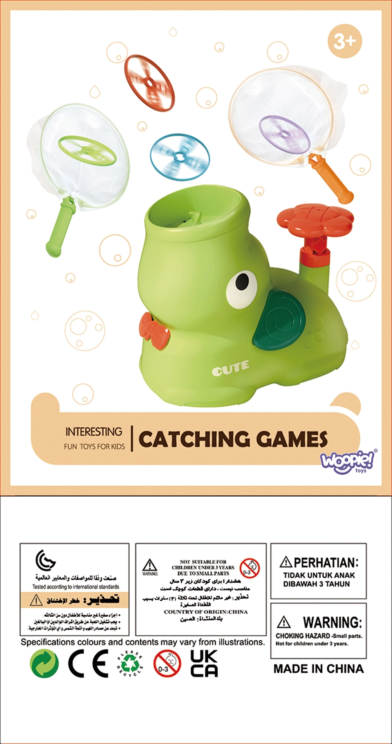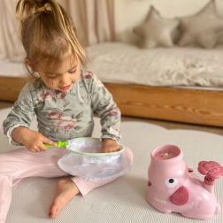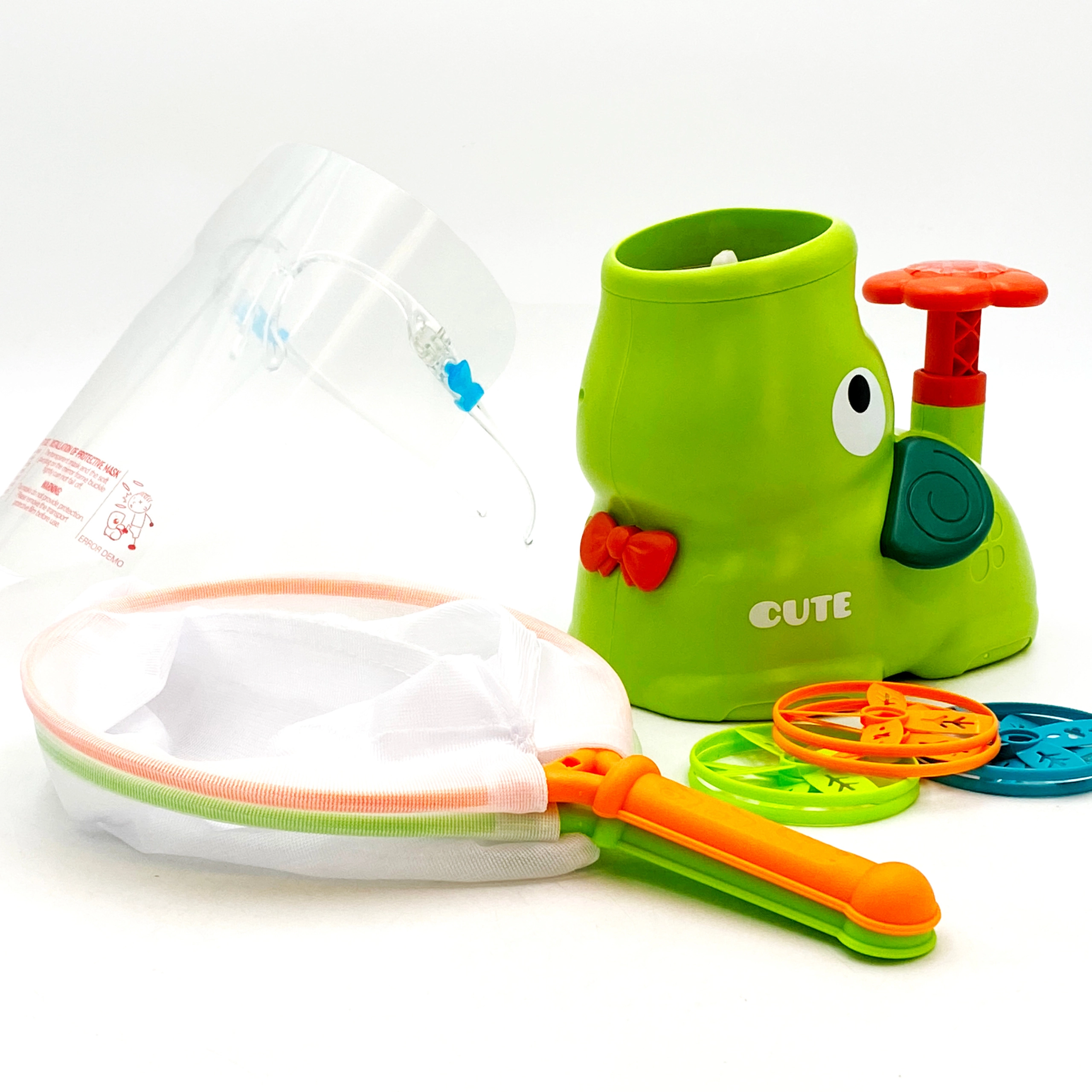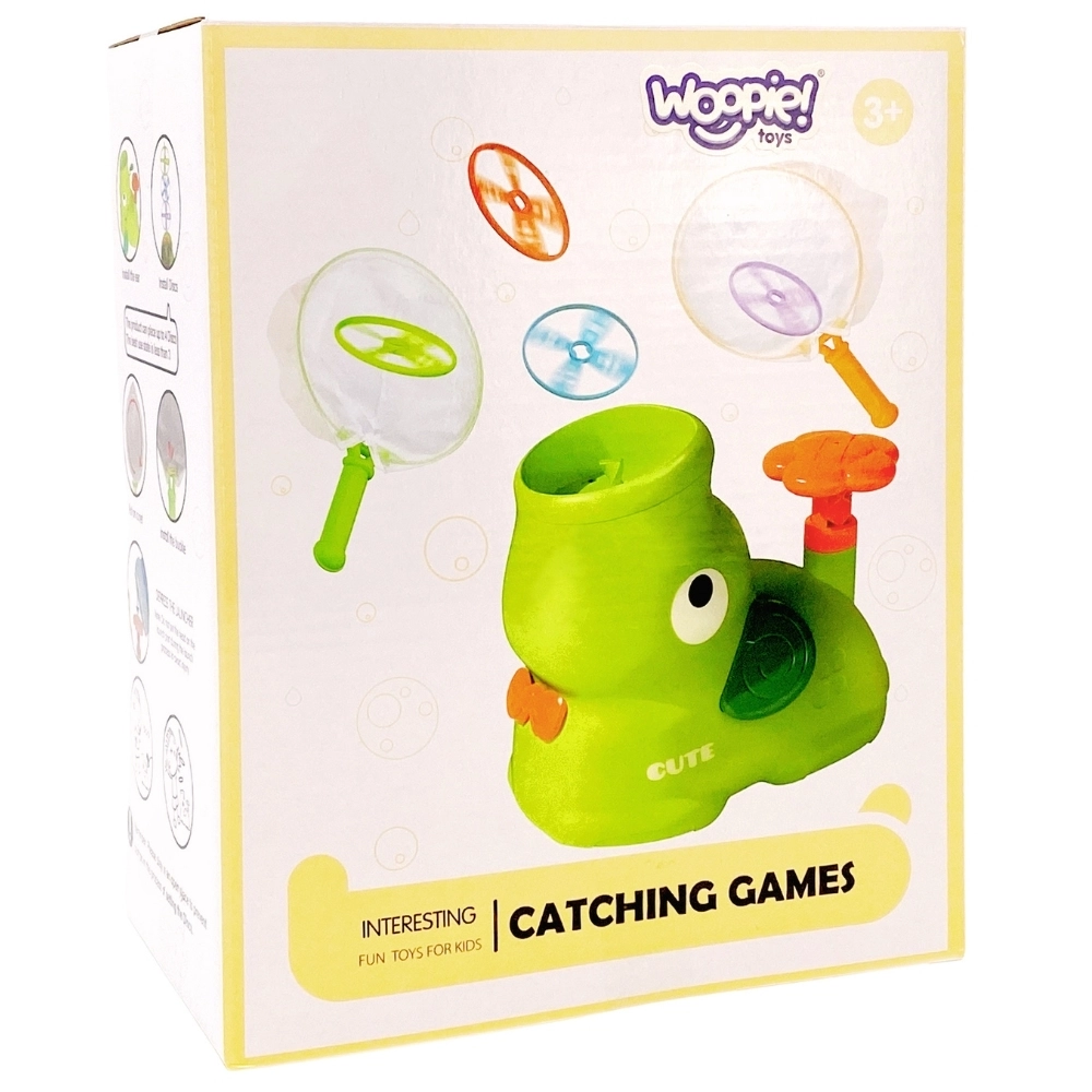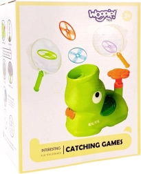 El lanzador con forma de elefantito impulsa el disco al aire: atrápalo con la red antes de que caiga. Un entrenamiento ideal de reflejos y coordinación.