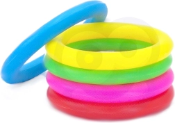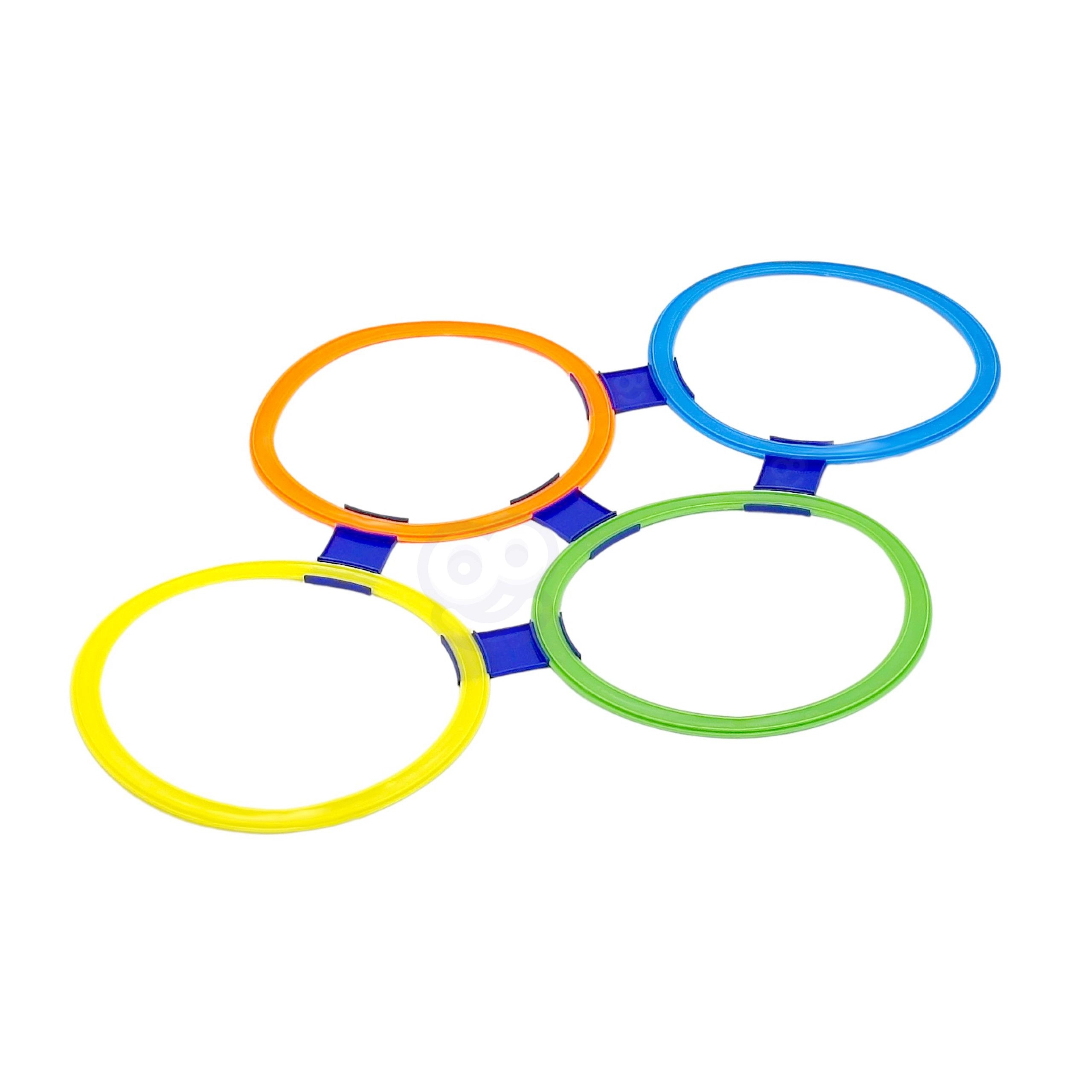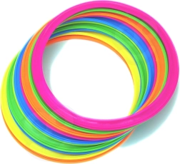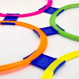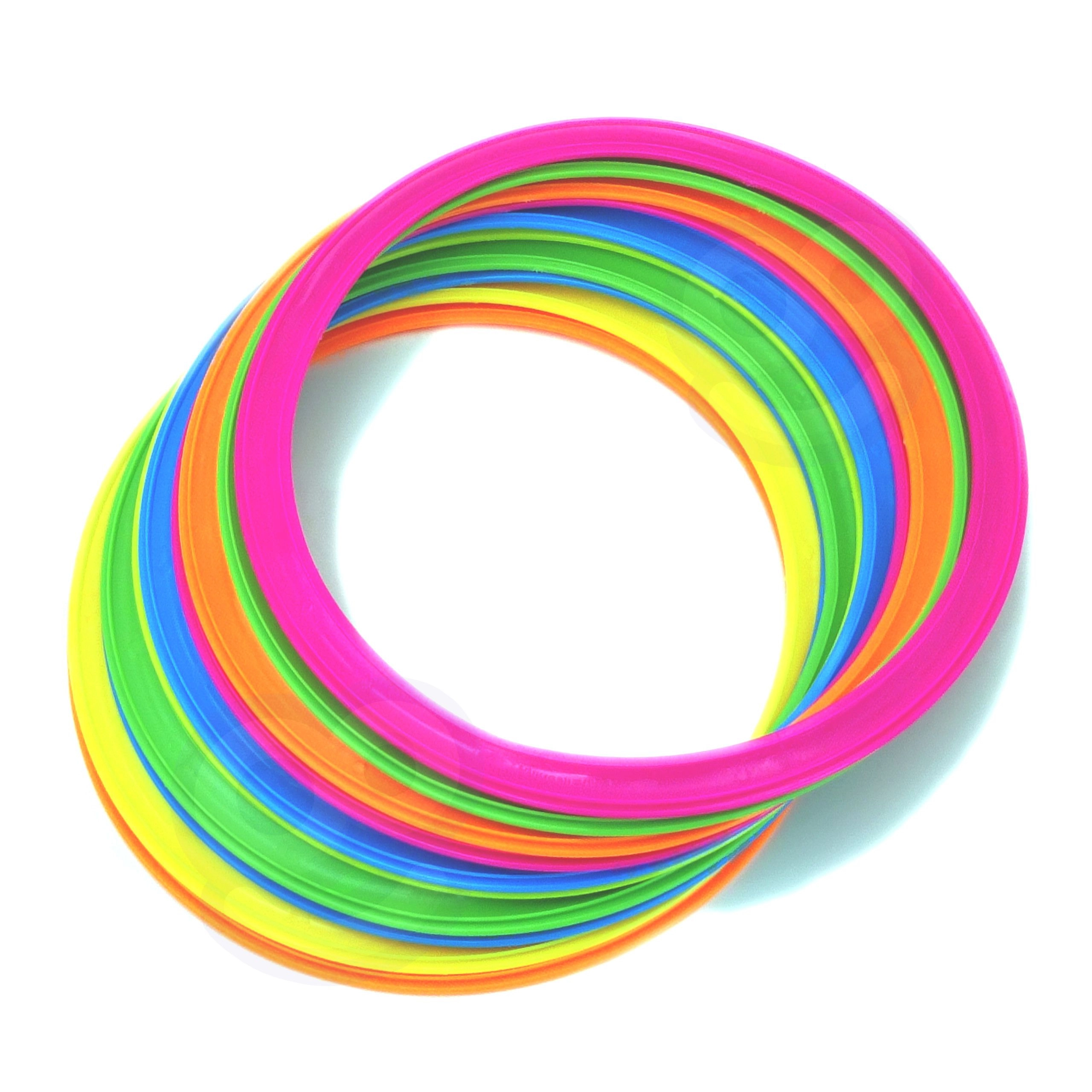 Contiene 10 aros conectables que se pueden montar libremente en distintas configuraciones para el juego de Rayuela.