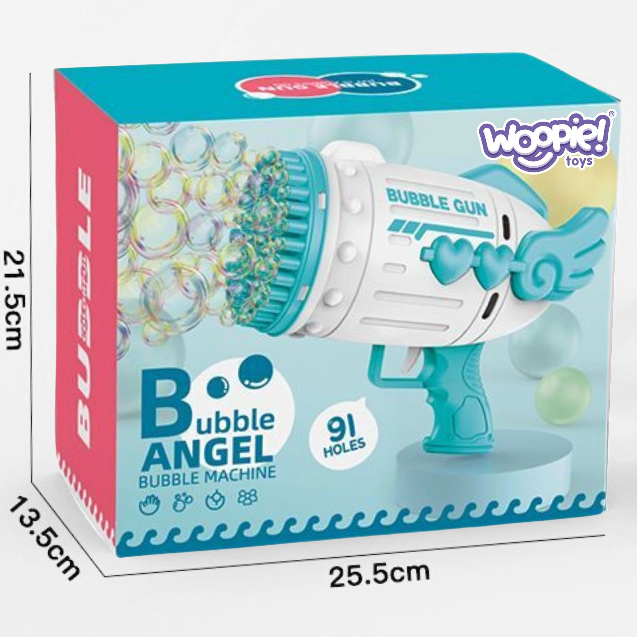 La pistola de burbujas WOOPIE es una diversión fantástica para niños a partir de 3 años. Gracias a sus 91 orificios genera burbujas con gran frecuencia, lo que ofrece un efecto espectacular y mucha alegría.