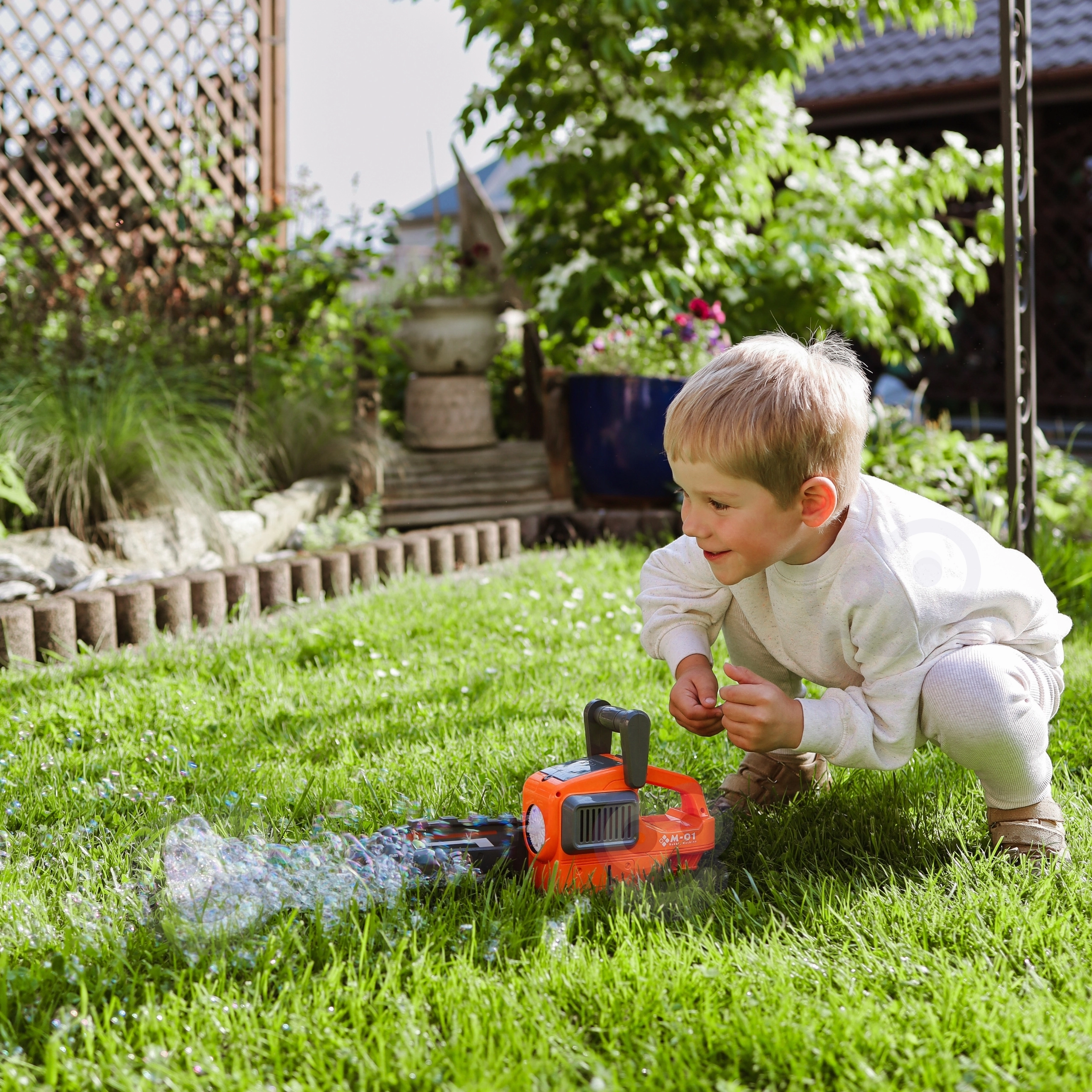 La salida giratoria con luces crea un flujo dinámico de burbujas en todas direcciones: un espectáculo visual perfecto para juegos en el jardín y fiestas infantiles.