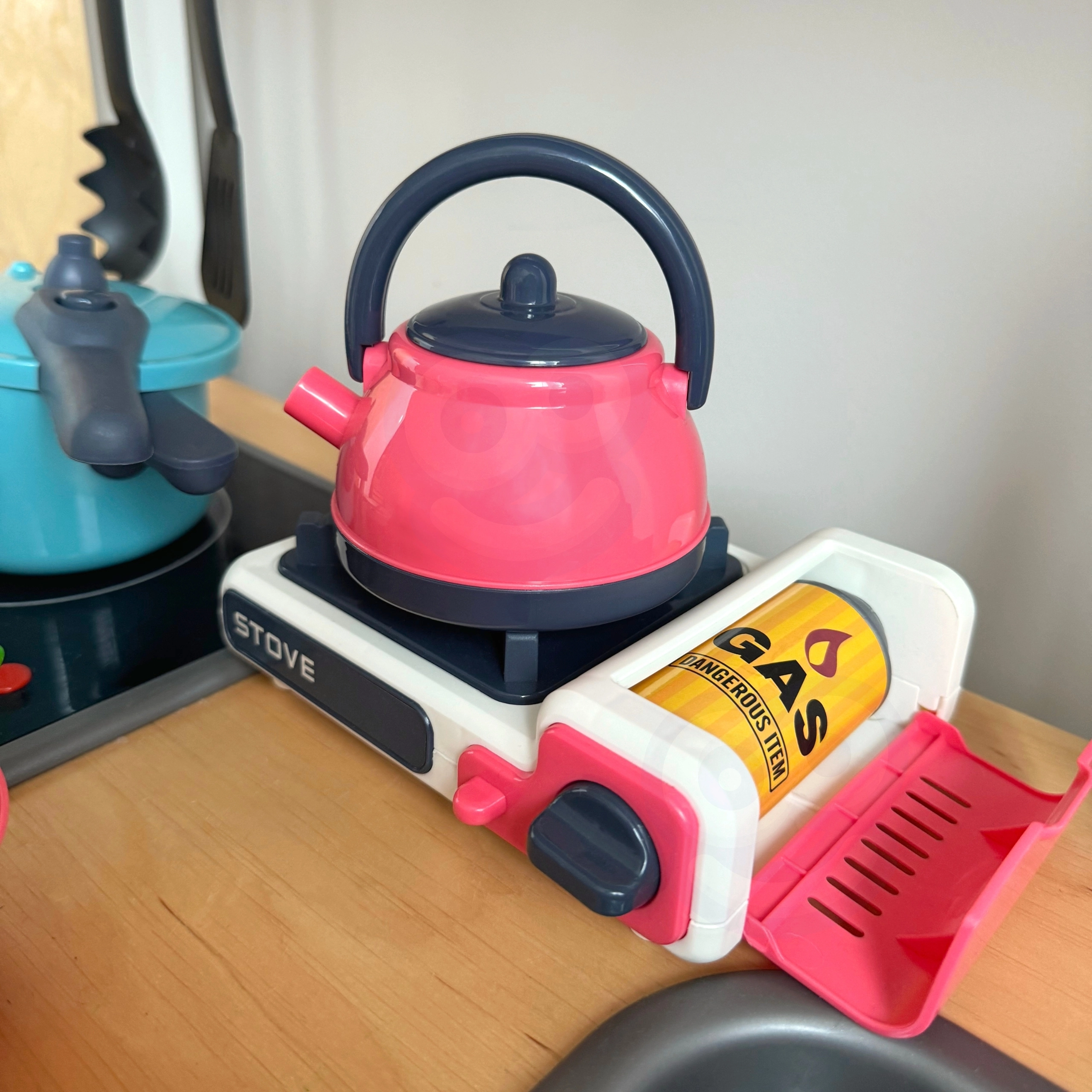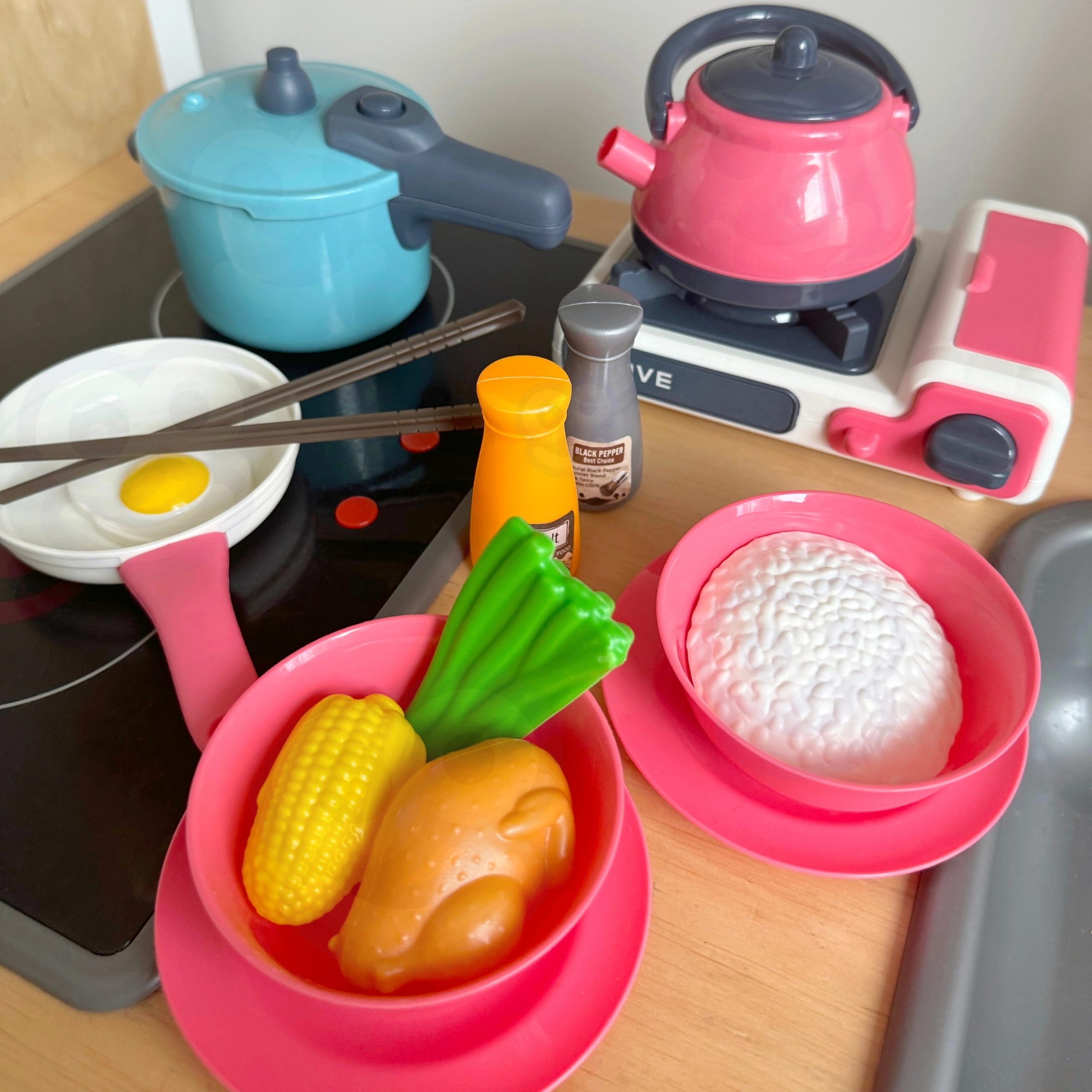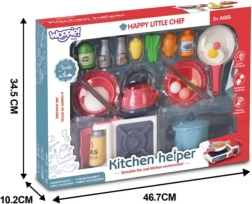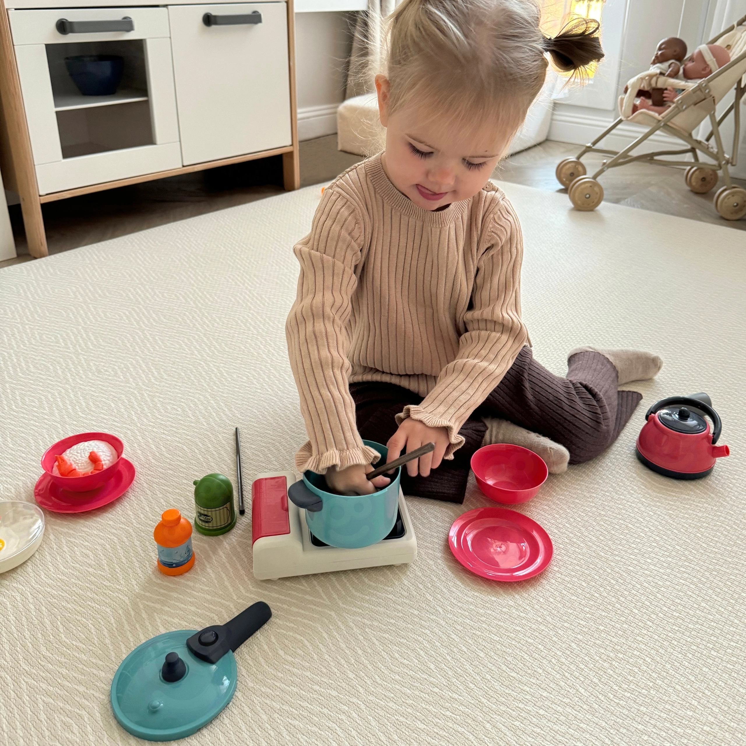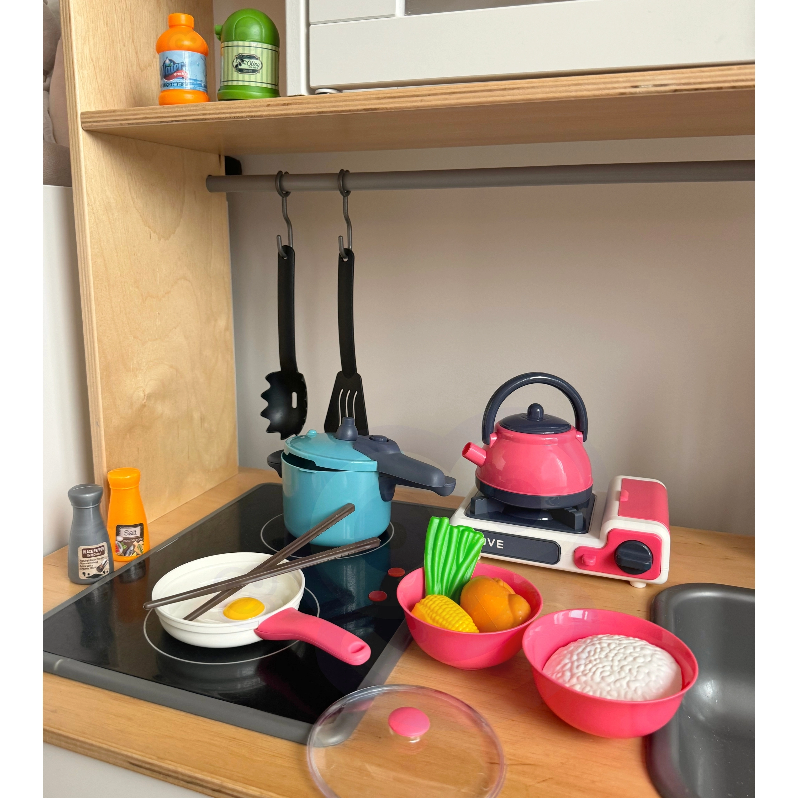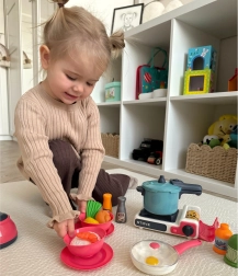 El set está fabricado con materiales seguros y el acabado detallado de auténticas herramientas de cocina garantiza seguridad y durabilidad. Este juguete no requiere pilas y además es compacto, lo que facilita su almacenamiento.