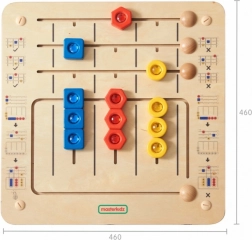 Este tablero educativo MASTERKIDZ de alta calidad está dividido en dos partes: una barra superior con tareas, donde los niños emparejan tres formas (hexágono rojo, cuadrado azul, círculo amarillo), y una parte inferior con tres columnas y 9 formas para clasificar. Gracias a los tiradores de colores, los niños también practican el reconocimiento de los colores. Todas las piezas están integradas en el tablero: se deslizan fácilmente, pero no se caen ni se pierden.