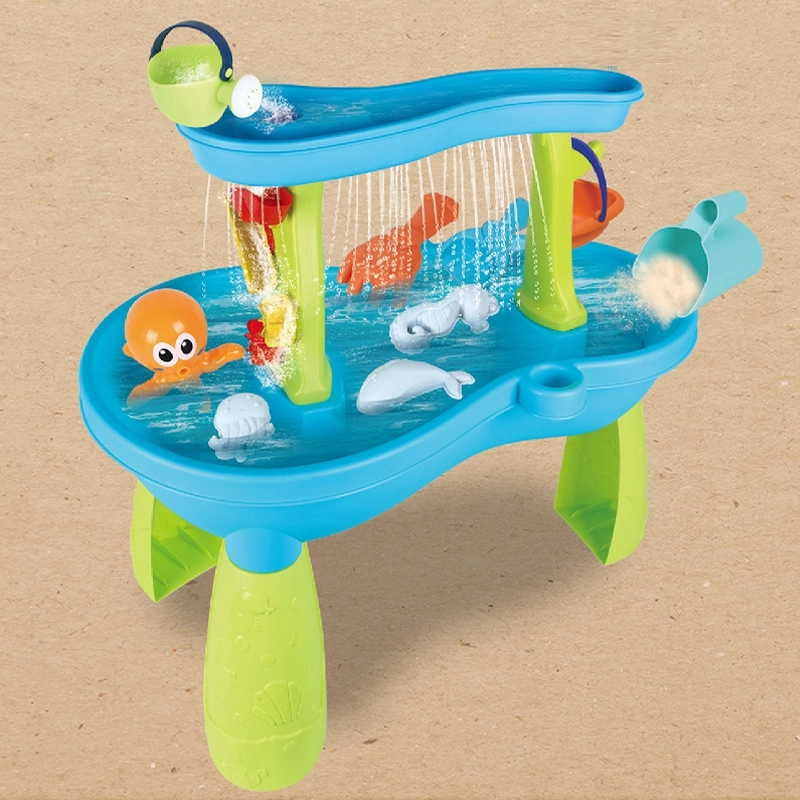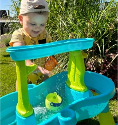 Los niños vierten agua en la parte superior de la mesa y observan cómo fluye a través de molinos de agua y orificios para un divertido efecto acuático.