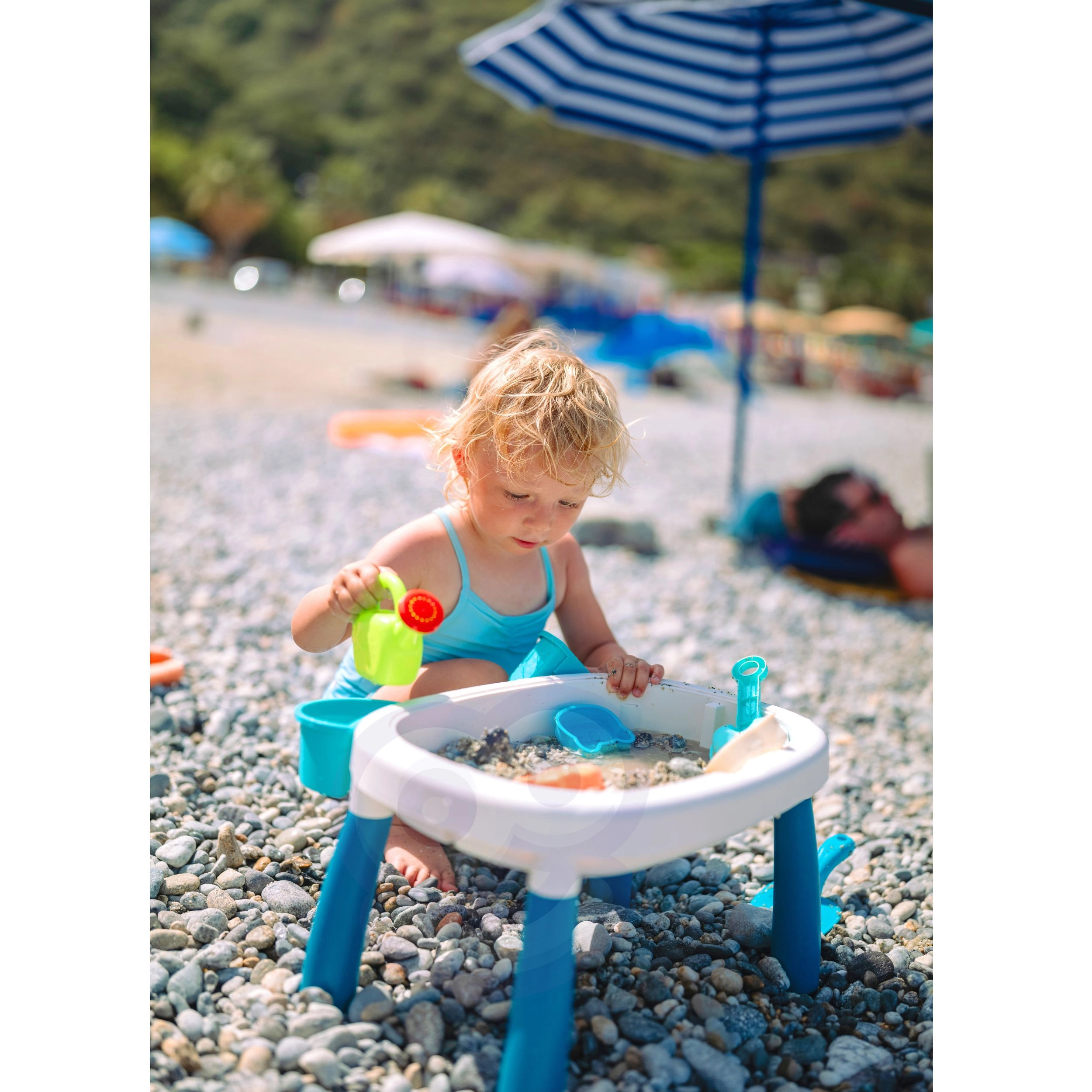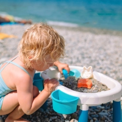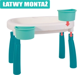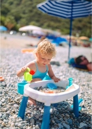 Descubre la versátil mesa infantil de agua y arena 2 en 1, que convierte cada tarde en un pequeño mundo vacacional. Dos contenedores separados permiten combinar juegos con agua y actividades con arena, mientras que las patas estables y el plástico resistente garantizan un juego seguro en casa, en el jardín o en la playa.
