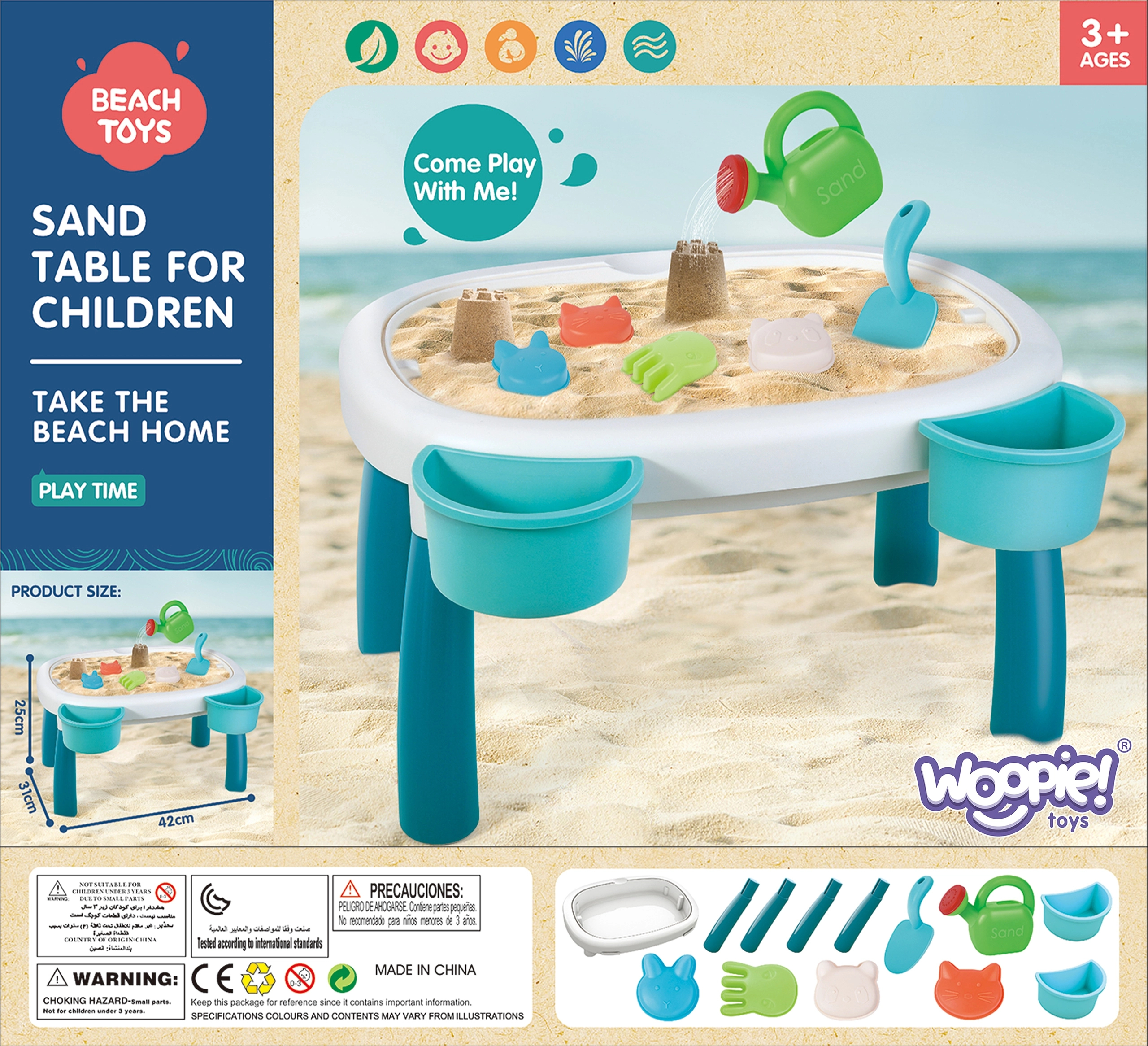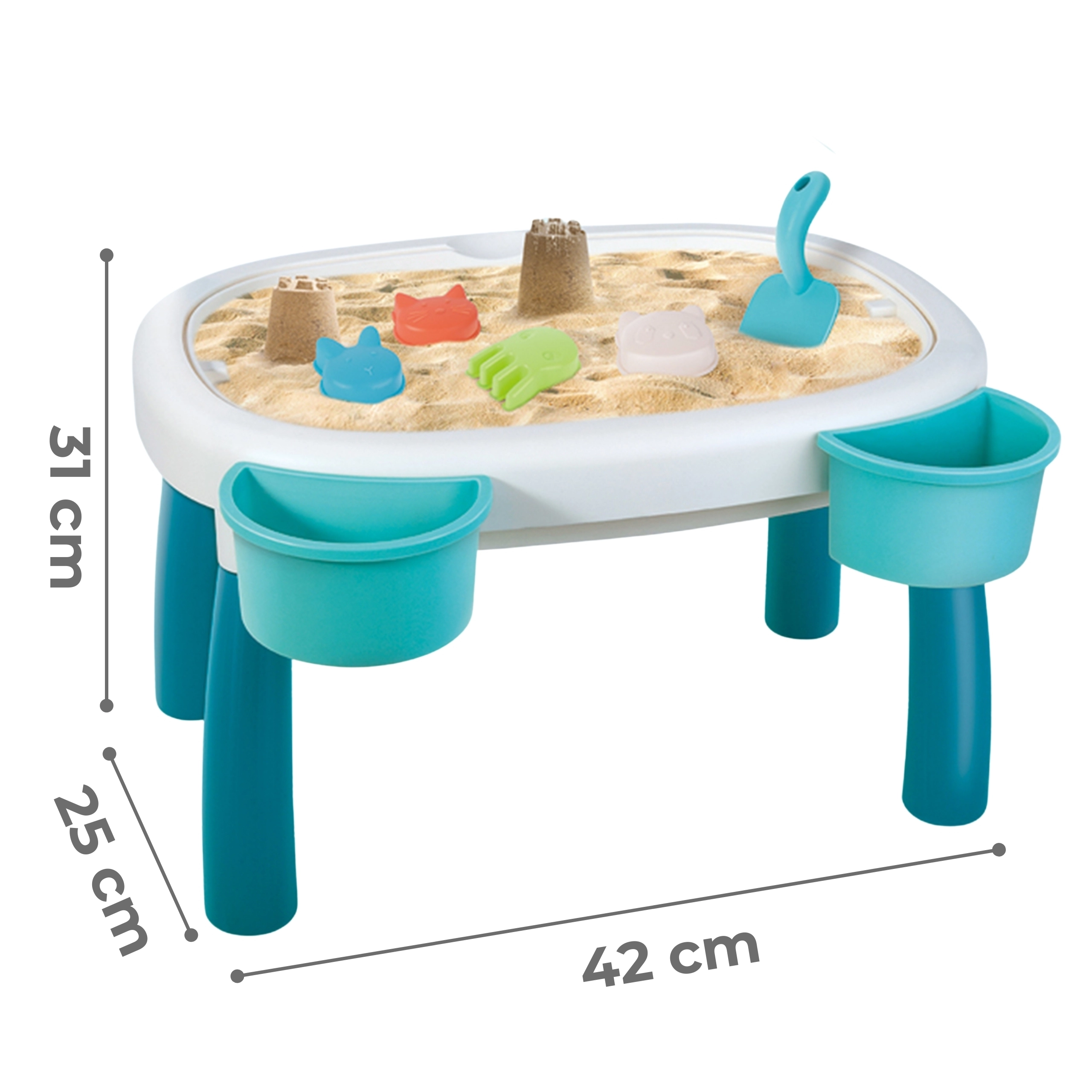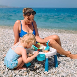 El paquete incluye 7 prácticos accesorios: regadera, pala, 4 moldes (erizo, gato, panda, conejito) y dos recipientes para la mesa. Gracias a ellos, los niños pueden crear construcciones de arena, trasvasar agua y desarrollar la creatividad y las habilidades manuales.