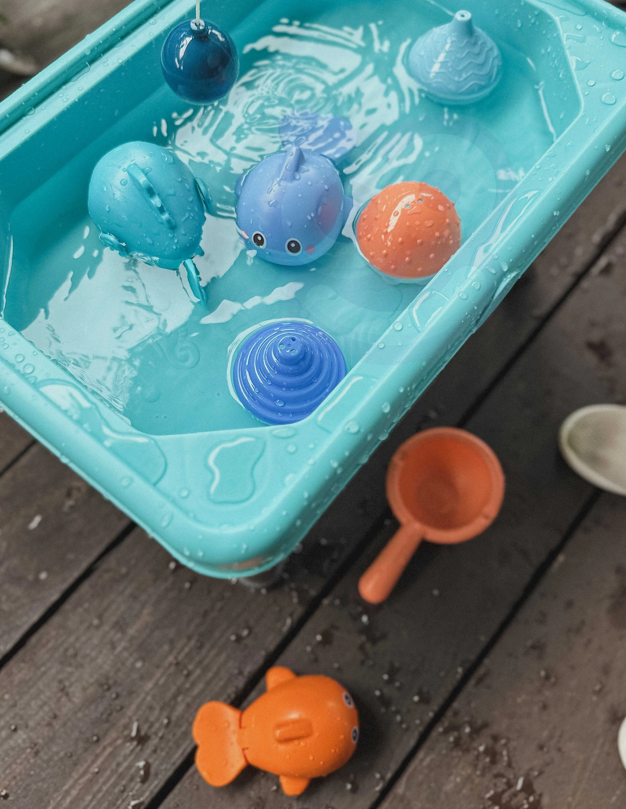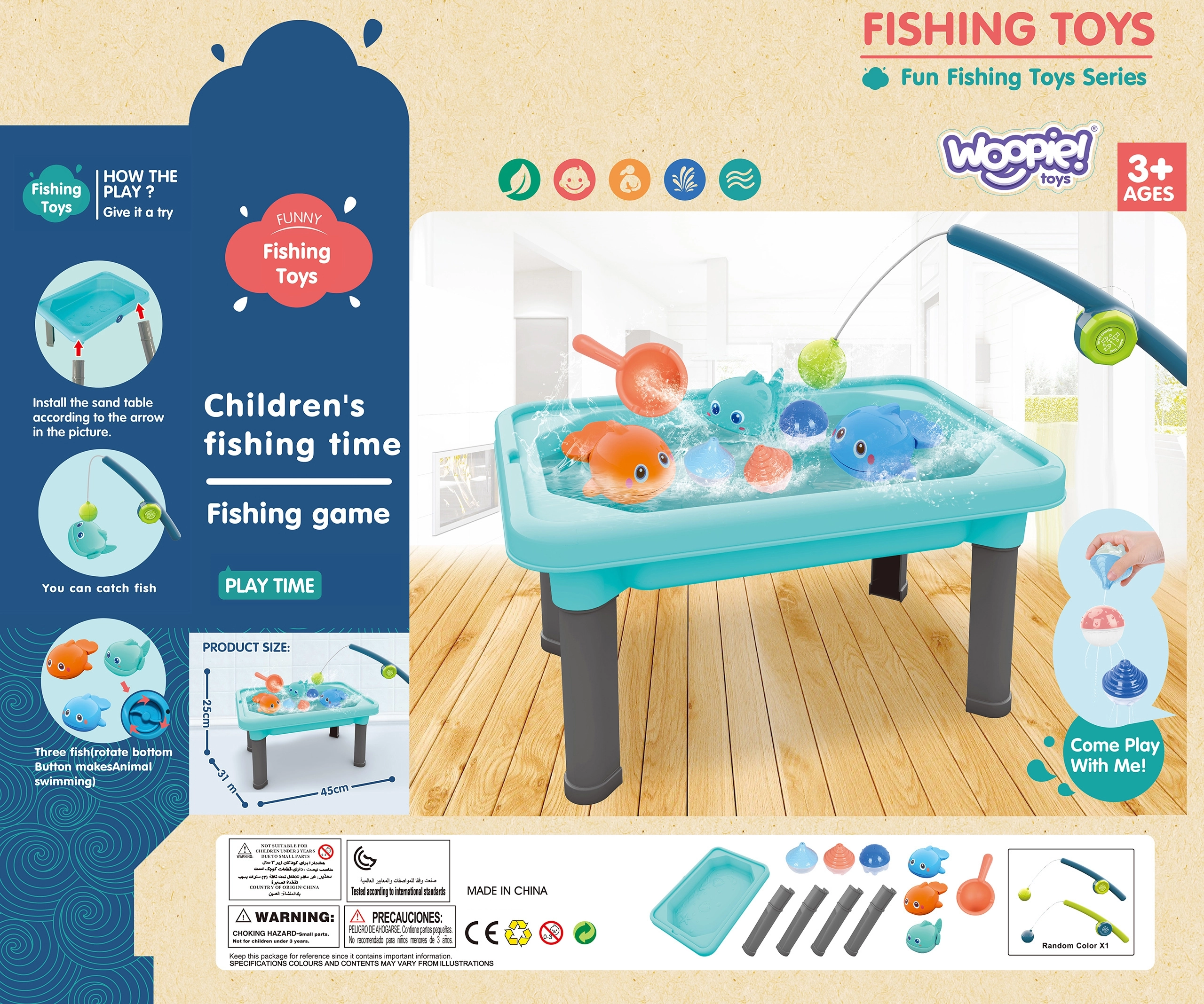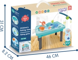 El set incluye un total de 6 piezas, entre ellas la mesita, una caña de pescar, una cucharita para agua y tres peces magnéticos. Además, los pececitos se pueden dar cuerda, por lo que nadan en la superficie del agua, inspirando a los niños a explorar.