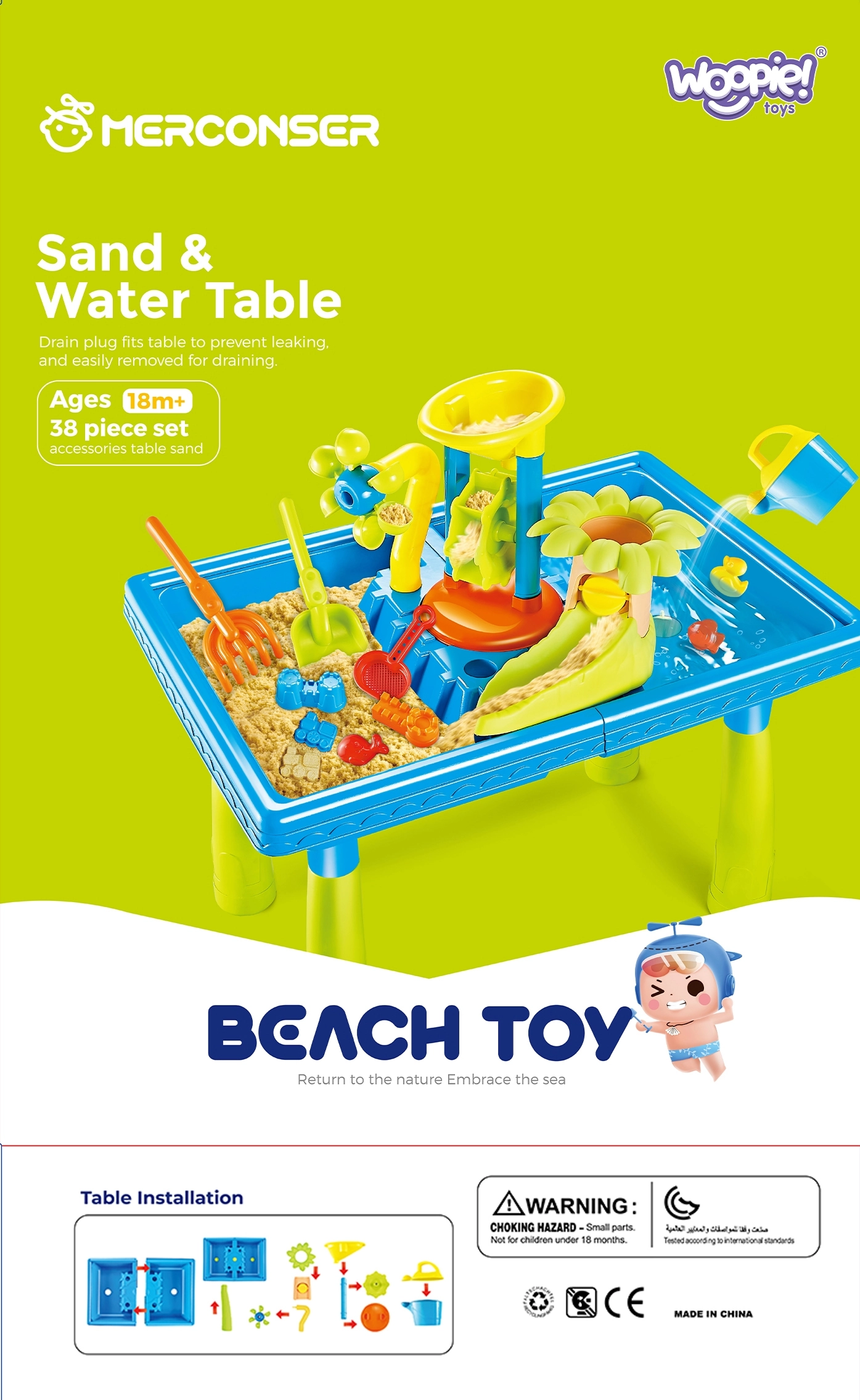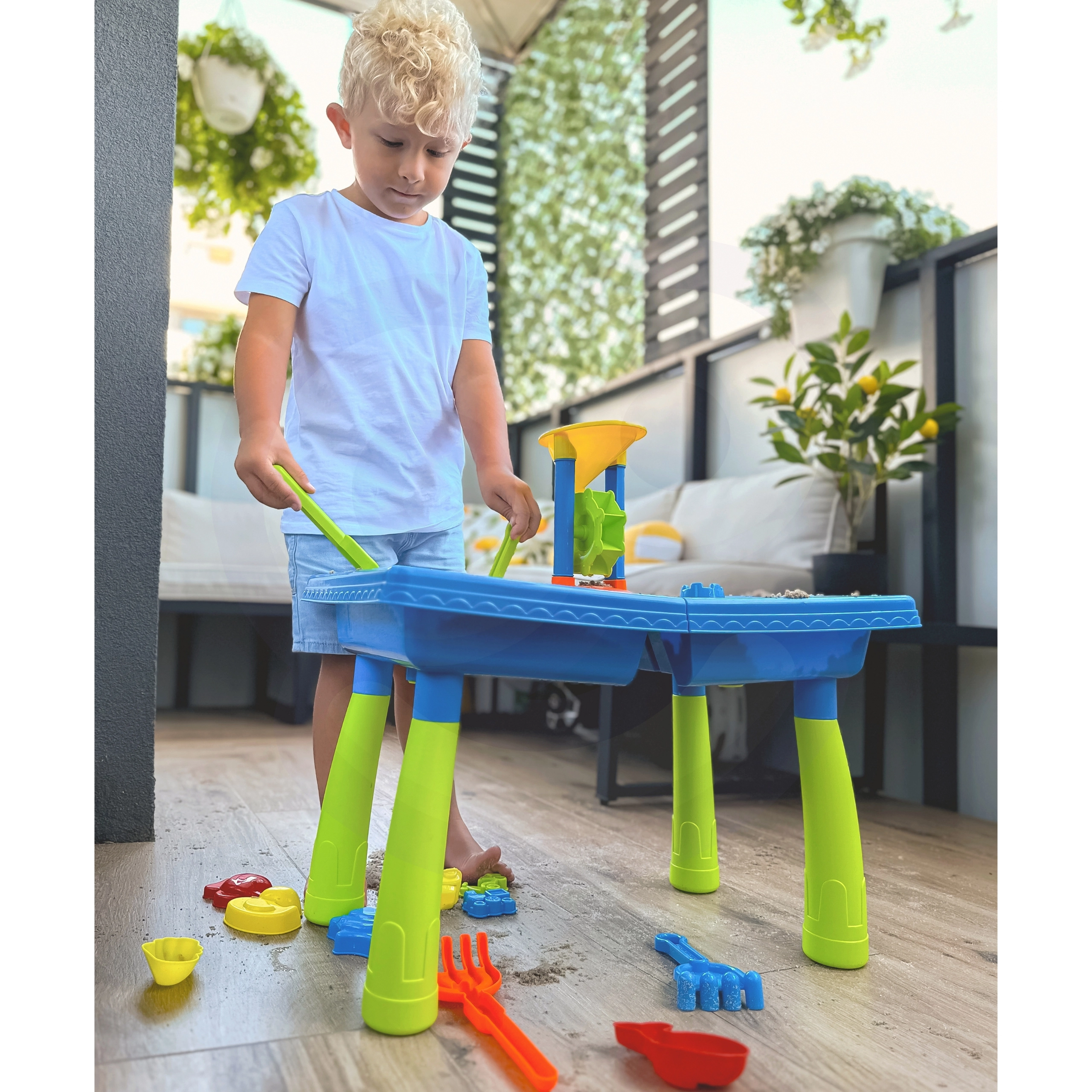 El paquete incluye: mesa de agua, regadera, 3 molinos de agua, 2 palas, colador y 12 moldes.