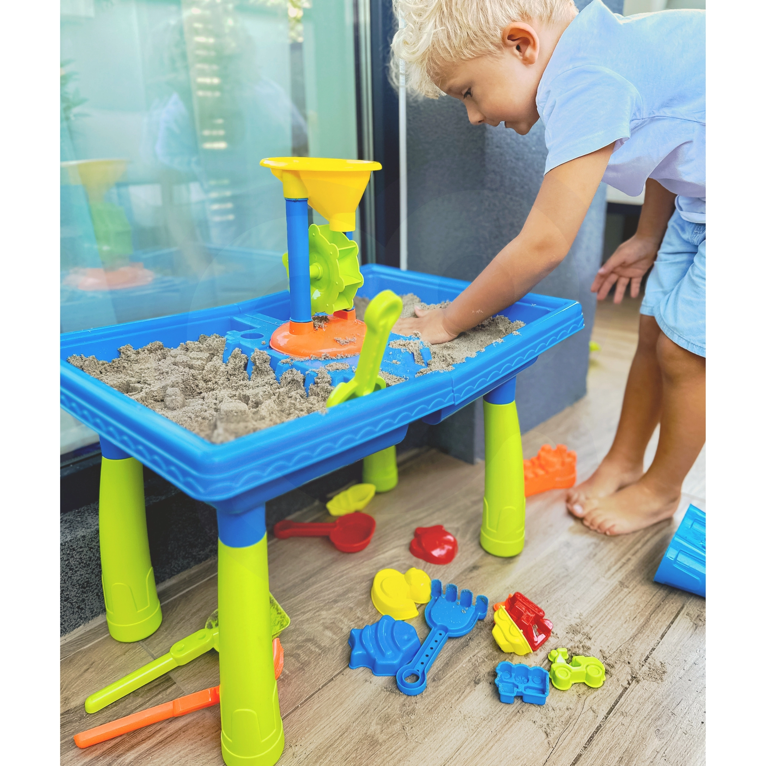 La mesa de agua y arena WOOPIE es perfecta tanto para jugar en el jardín como en casa. Ofrece una gran combinación de juegos con arena y agua y, gracias a elementos interactivos como los molinos de agua, el juego es aún más divertido.