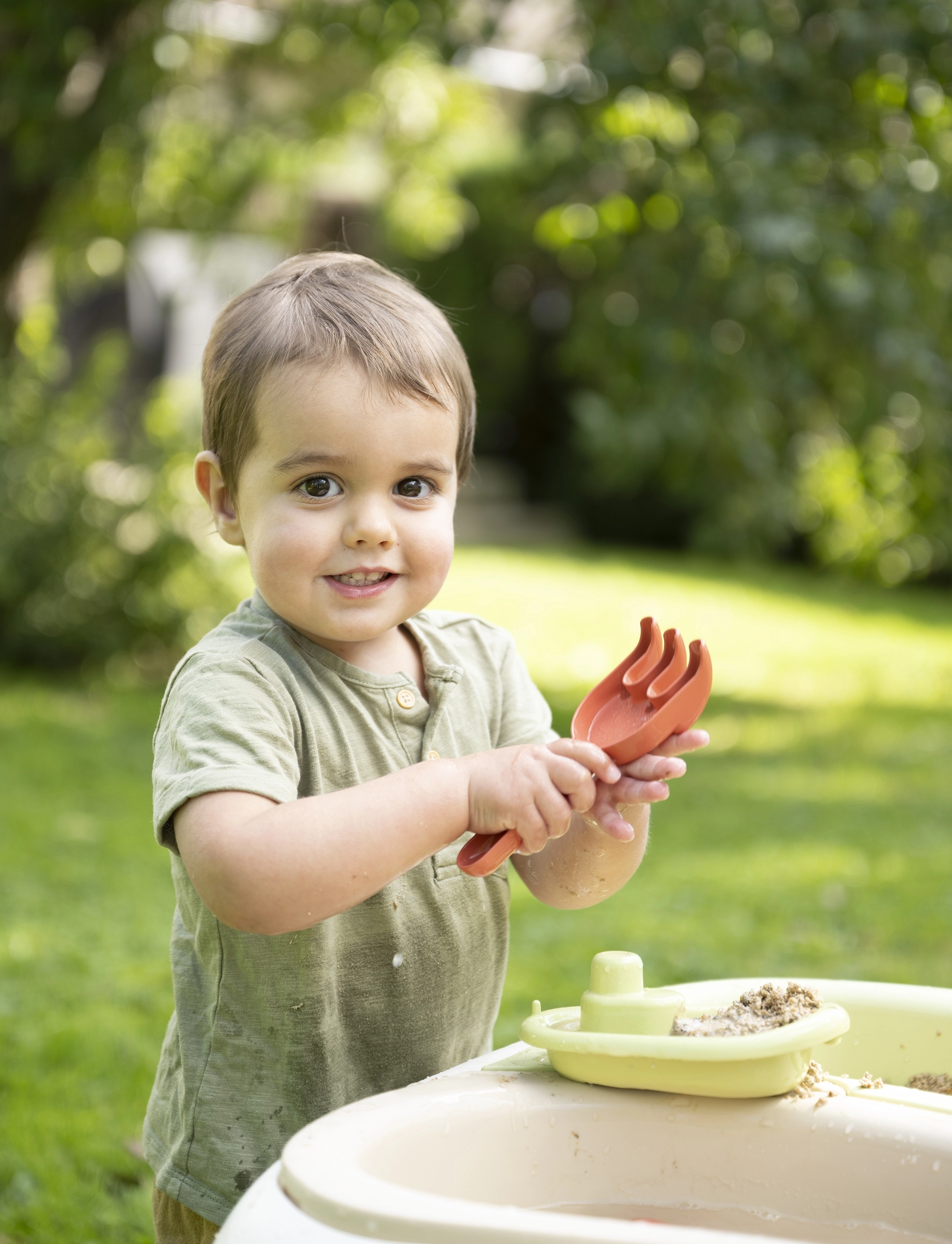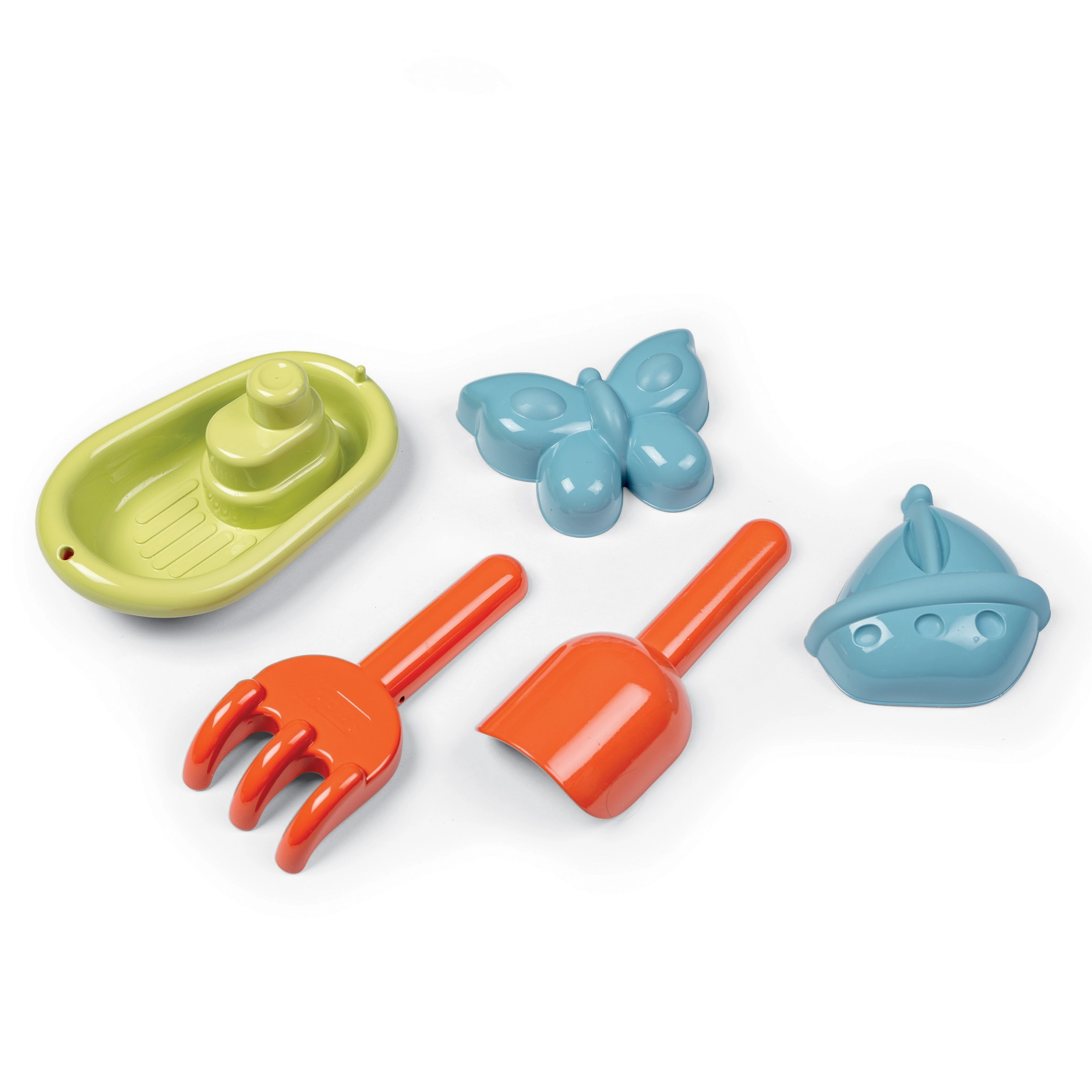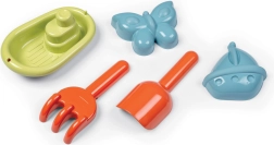 Barquito, pala, rastrillo y dos moldes invitan a crear, recoger, verter y desarrollan la motricidad fina y la imaginación.