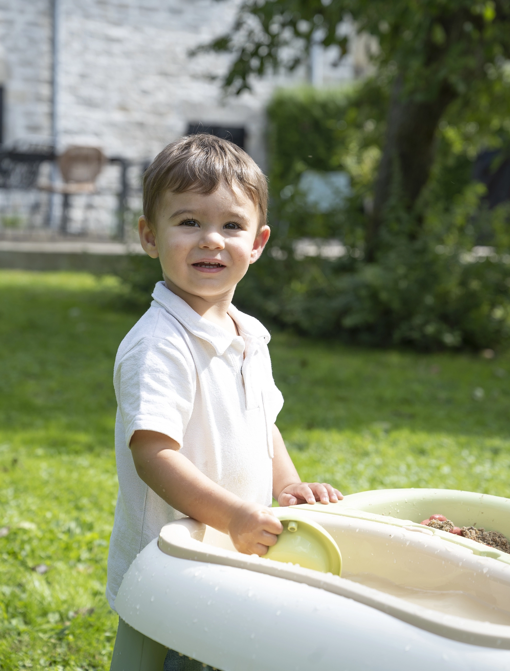 La mesa de juegos exterior SMOBY combina la exploración sensorial con funciones prácticas. Gracias a dos cubetas grandes y extraíbles, los niños pueden verter agua, tamizar arena y crear sus propios mundos. La estructura resistente de materiales reciclados está diseñada para el juego diario y un mantenimiento sencillo.