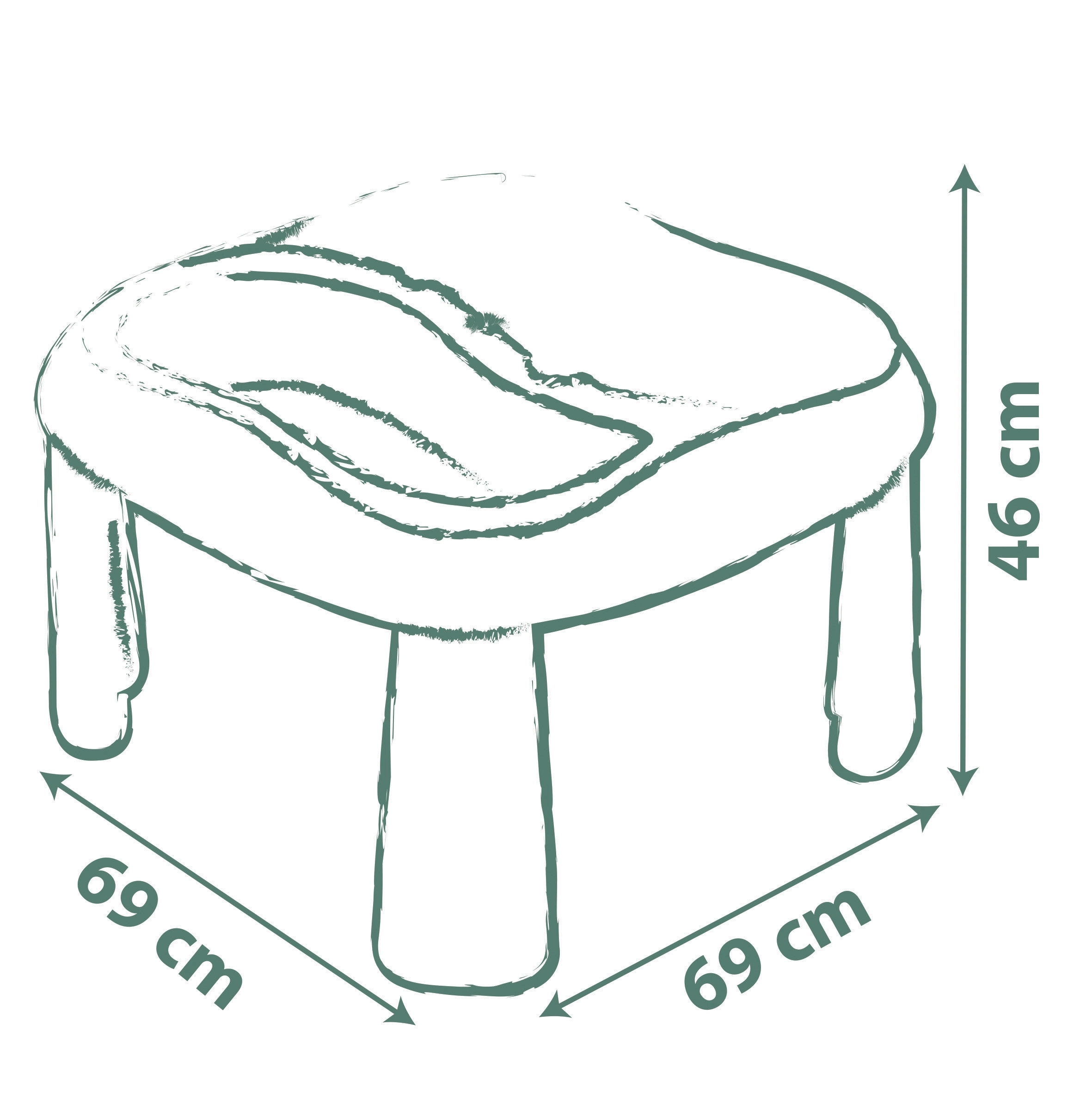 La mesa está fabricada en un 83 % de plástico reciclado y es apta para condiciones exteriores. Su estructura robusta soporta el juego diario.