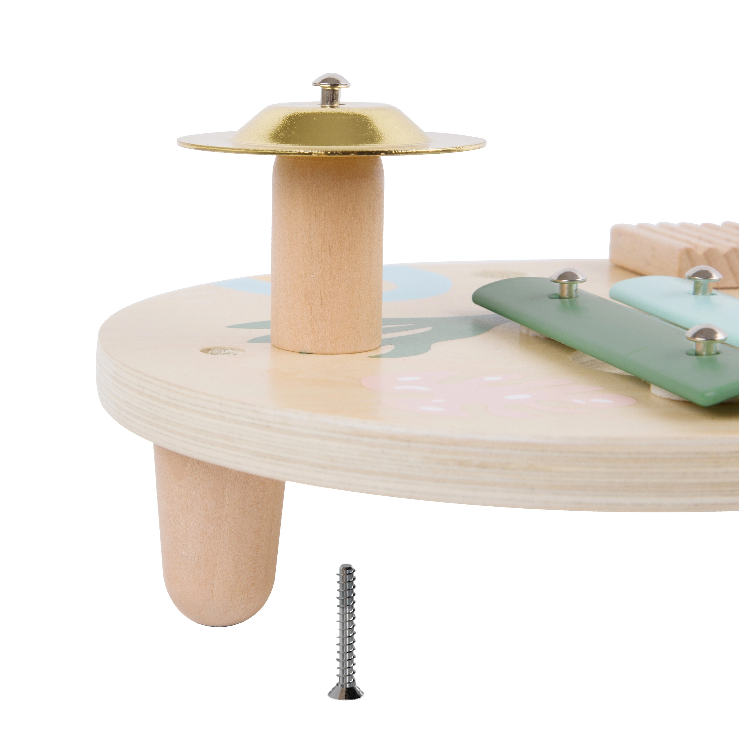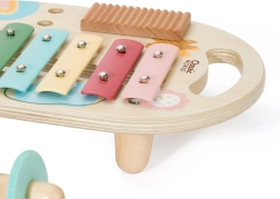 El set incluye cinco instrumentos: metalófono, maracas, tambor y dos baquetas, ideal para descubrir la música.