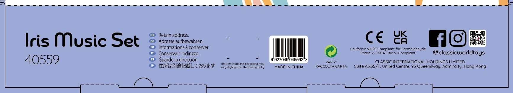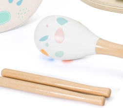 Este set incluye cinco instrumentos musicales diferentes que se adaptan perfectamente a las manos pequeñas de los niños. Cada instrumento está hecho de madera de alta calidad y pintado con pinturas no tóxicas, seguras para los niños y el medio ambiente.