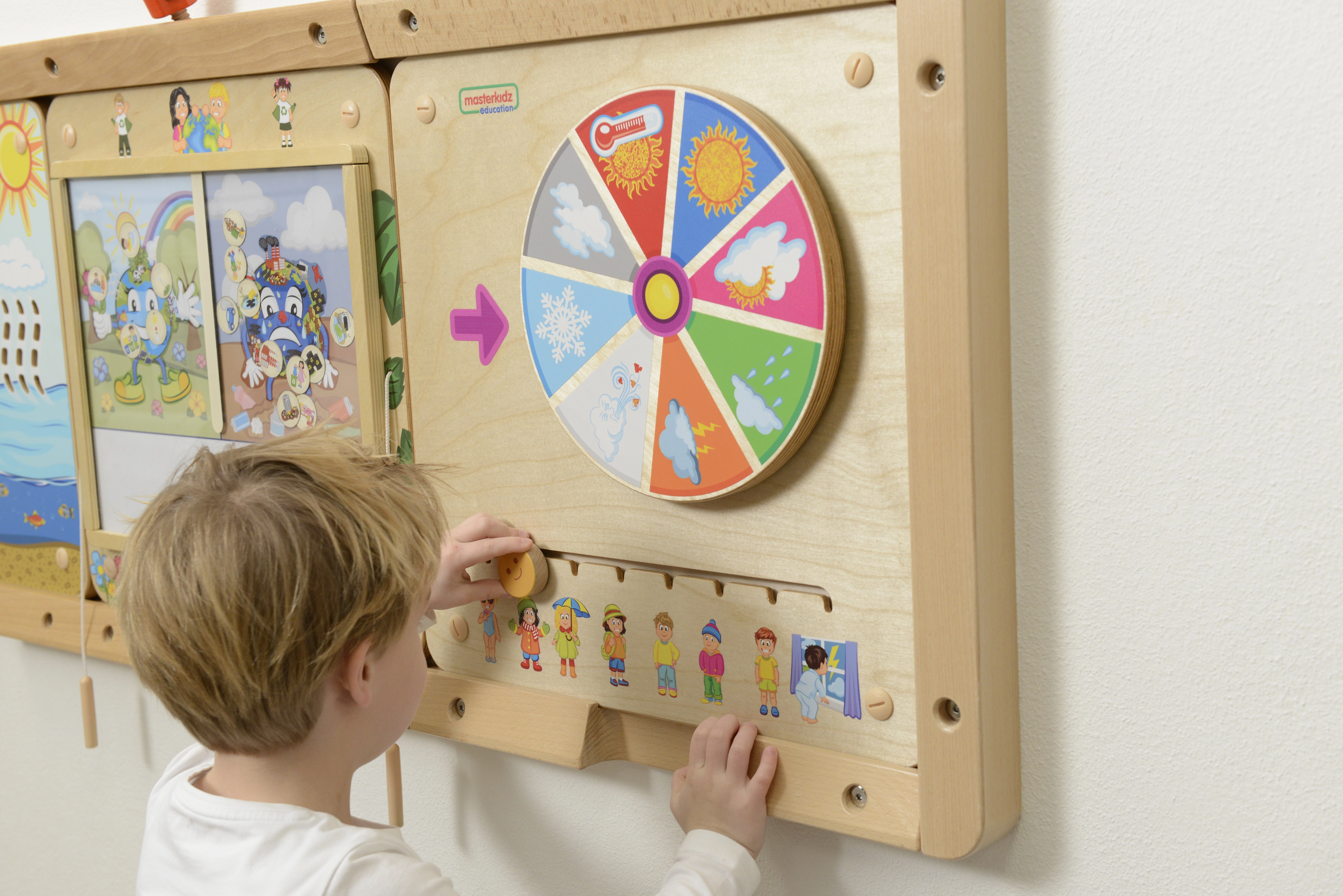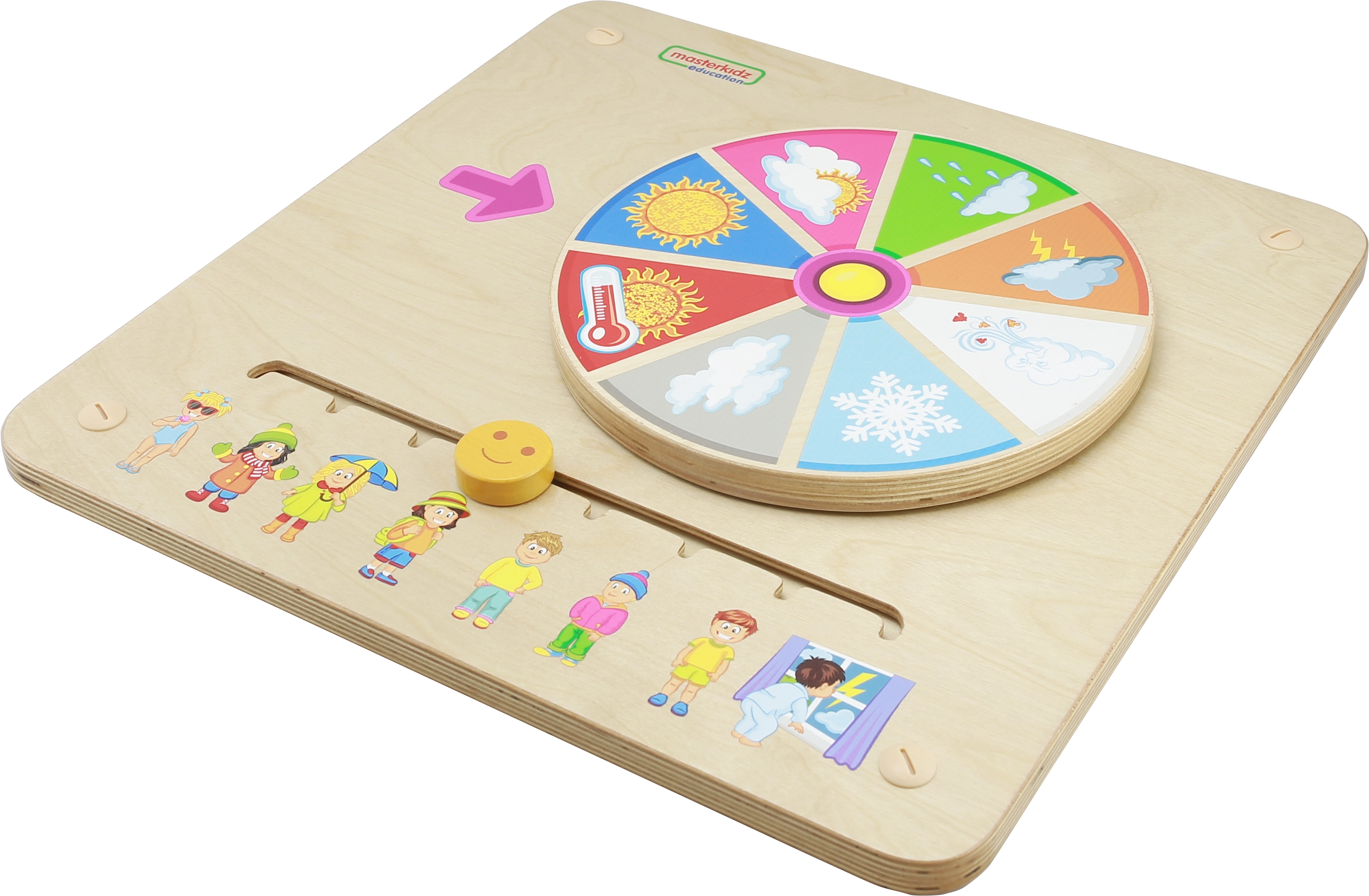 Con la rueda giratoria y el control deslizante de la pizarra, los niños pueden explorar diferentes condiciones meteorológicas y qué ropa es adecuada para cada una de ellas.