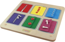 Este tablero educativo de madera de alta calidad ofrece a los niños un espacio seguro para practicar mecanismos de cierre reales. Cada uno de los 6 bolsillos horizontales representa un tipo distinto de cierre, común en chaquetas, sudaderas o camisas, para que los niños aprendan habilidades útiles para el día a día.