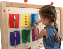 Seis paneles textiles reproducen fielmente los cierres de chaquetas y camisas. Los niños practican de forma segura cremalleras, botones y broches antes de usarlos en la vida real.