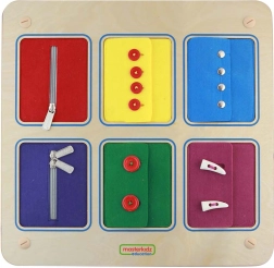 Desarrolla la destreza infantil con el tablero Montessori de madera MASTERKIDZ. Seis bolsillos textiles de colores simulan el abrochado de la ropa y enseñan habilidades prácticas: cremalleras, botones, broches de presión y cremallera doble. La construcción de madera resistente y el juego significativo fomentan la motricidad fina, la coordinación ojo–mano y la autonomía.