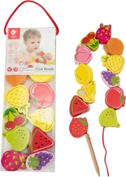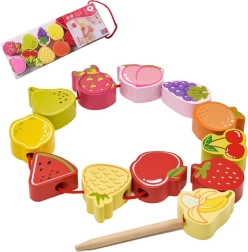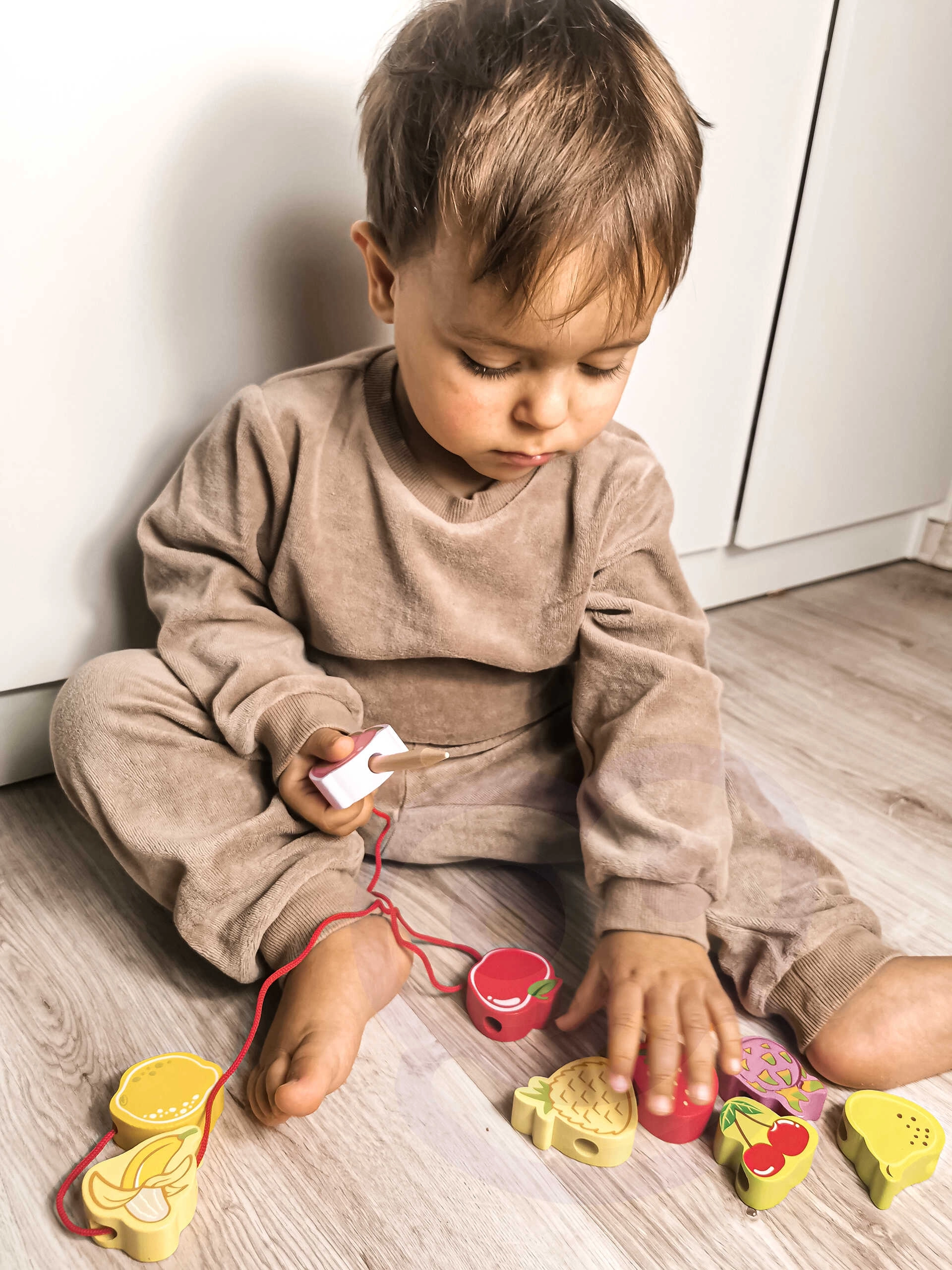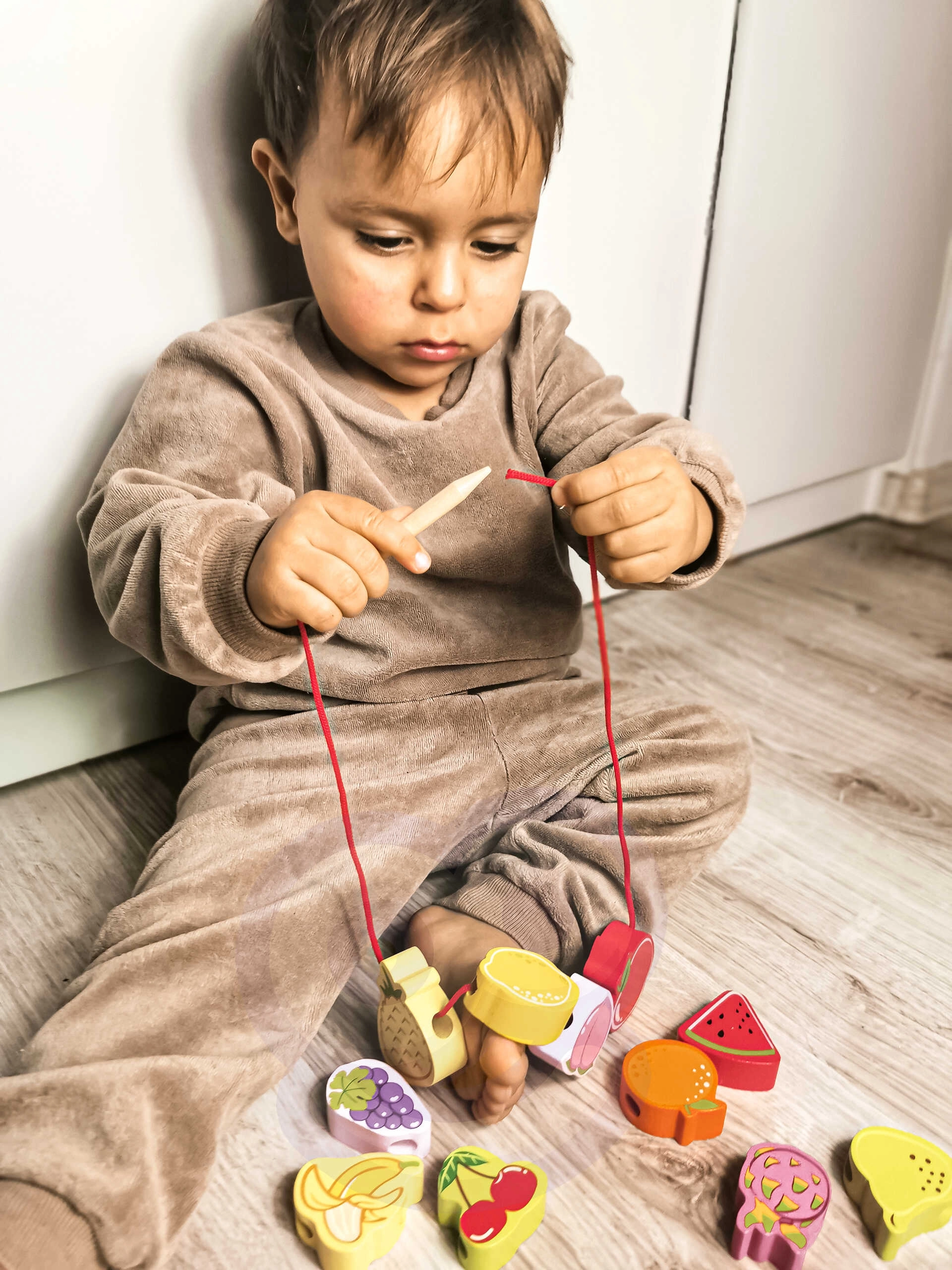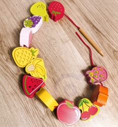 Ensartar las cuentas con forma de fruta en la cuerda con aguja de madera entrena de forma natural el agarre, la precisión de los movimientos y la coordinación mano–ojo.