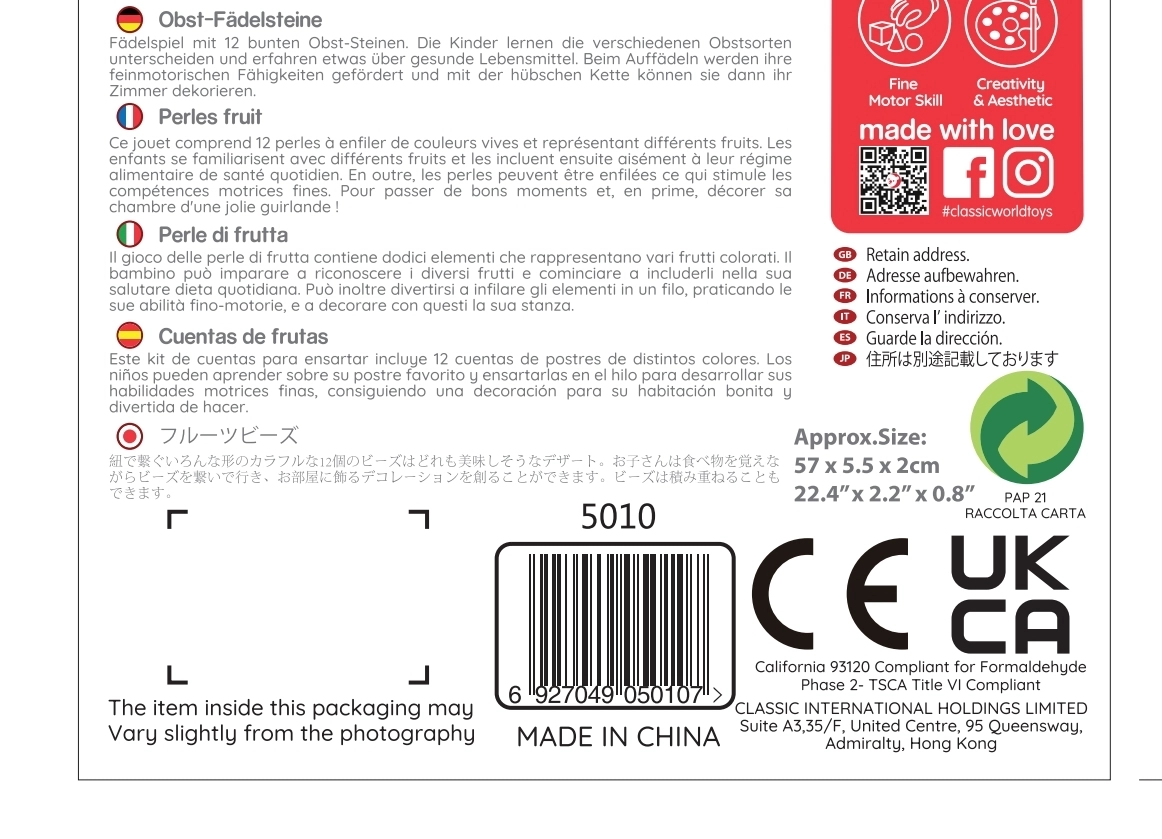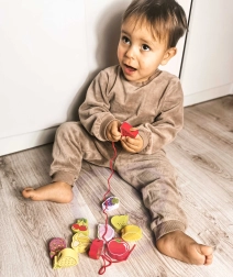 Los componentes están fabricados con madera lacada de calidad y coloreados con pinturas seguras y no tóxicas. El set es resistente, agradable al tacto y fomenta el juego creativo y abierto: las cuentas pueden ordenarse en cualquier secuencia para crear sus propias “guirnaldas de frutas”.