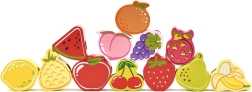 El set incluye formas coloridas de fresa, plátano, uva y otros frutos. Los niños aprenden a reconocer los colores y los nombres de las frutas mientras juegan.