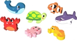 - - 7 piezas que representan animales submarinos, como ballena, tiburón o tortuga.