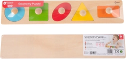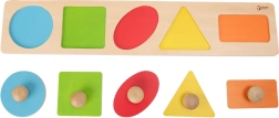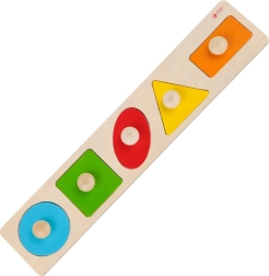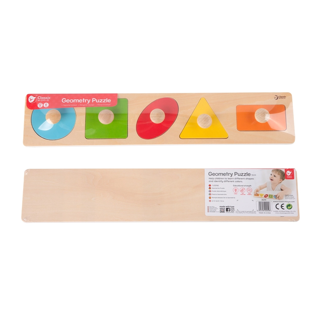 El rompecabezas de madera Classic World está diseñado para niños a partir de 12 meses. Este juguete incluye una base con formas recortadas y 6 piezas con perillas que corresponden a las formas de la base. Todas las piezas son fáciles de agarrar gracias a las pequeñas perillas.