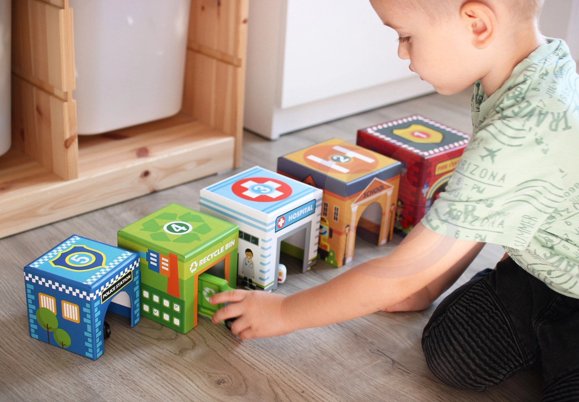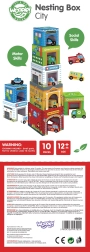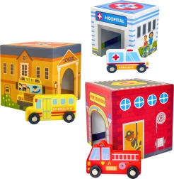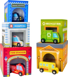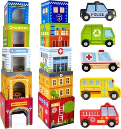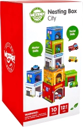 La ciudad encajable WOOPIE GREEN es una alternativa creativa a los bloques clásicos. Cinco cubos de cartón ilustrados representan edificios urbanos conocidos (p. ej., bomberos, escuela, hospital, policía) y están numerados del 1 al 5 para facilitar el aprendizaje de conteo y tamaños. Las aberturas especiales en los cubos permiten encajar y guardar los vehículos, para que los niños creen sus propias historias y escenas de la vida en la ciudad.