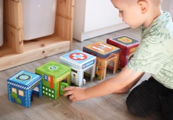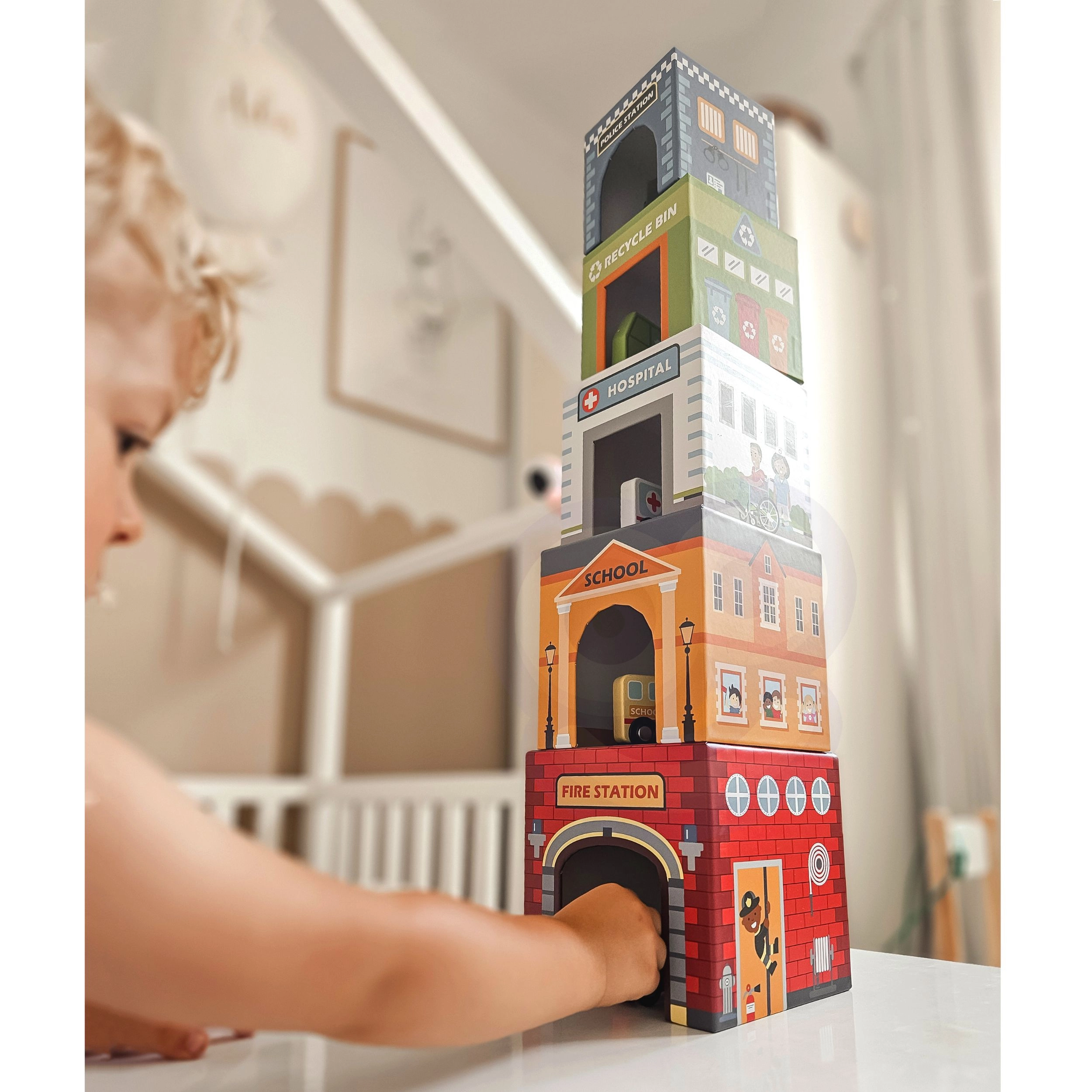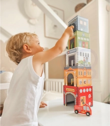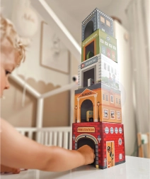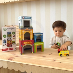 Cinco cubos numerados con aberturas permiten construir torres, encajar los vehículos dentro y descubrir la ciudad de forma lúdica: ideal para desarrollar la imaginación.