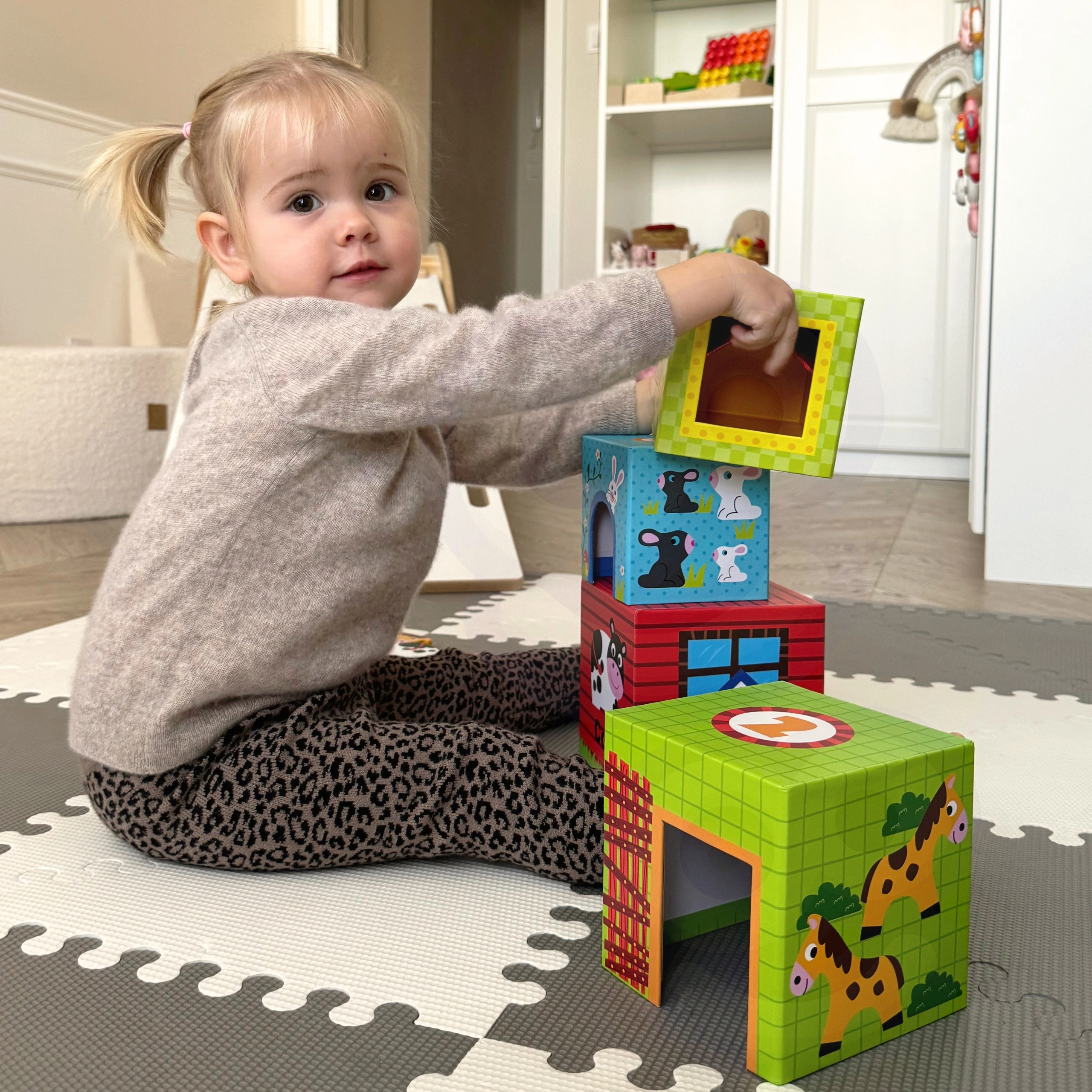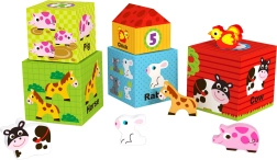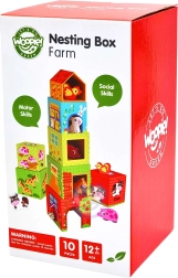 Los cubos apilables WOOPIE GREEN Granja combinan la construcción creativa con un aprendizaje inteligente. Cada caja representa una casita diferente, desde la gallinita más pequeña hasta la vaquita más grande, está numerada e ilustrada para que el niño comprenda fácilmente los tamaños, el orden y el conteo. Gracias a las aberturas, los niños pueden esconder los animales dentro y crear sus propias historias de granja.