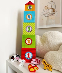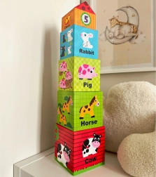 Los cubos numerados con ilustraciones claras enseñan al niño a distinguir tamaños, contar y familiarizarse con los nombres de los animales en inglés, de forma natural durante el juego.