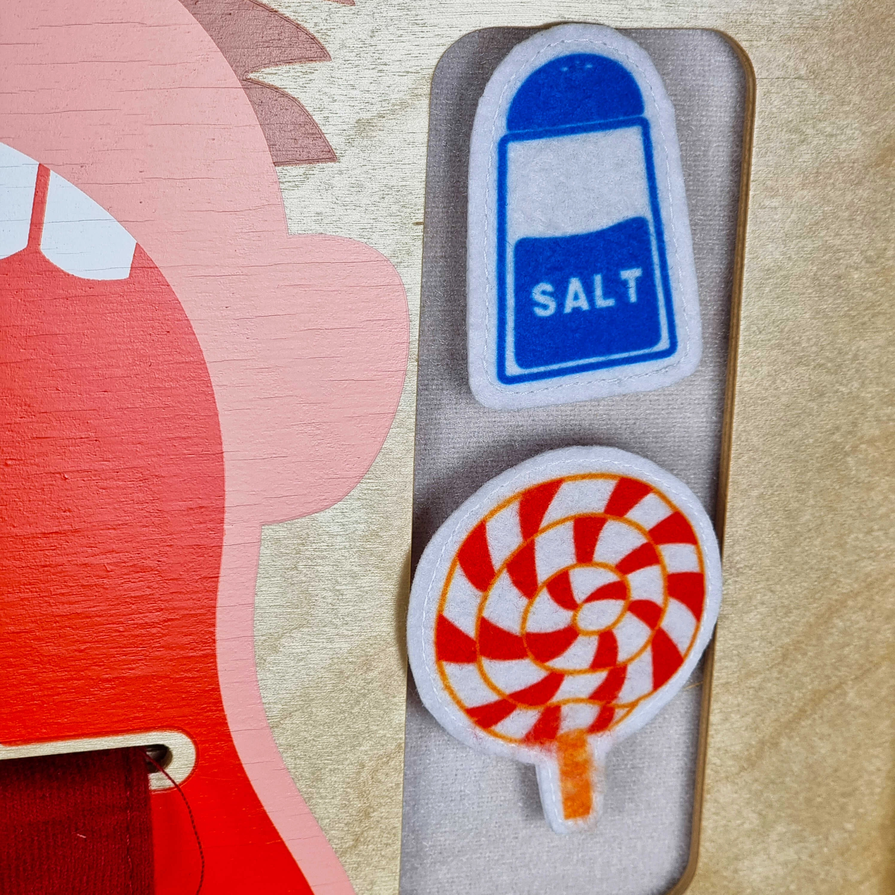 Una gran lengua móvil con sabores claramente marcados y alimentos con cierre de velcro enseñan a los niños a distinguir los sabores dulce, salado, ácido y amargo.