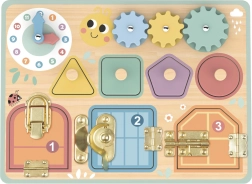 El tablero incluye tres tipos de cerraduras, detrás de las cuales se esconden imágenes de animales que estimulan la imaginación y la curiosidad de los niños.